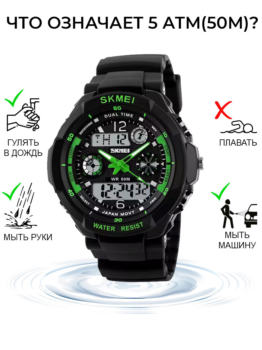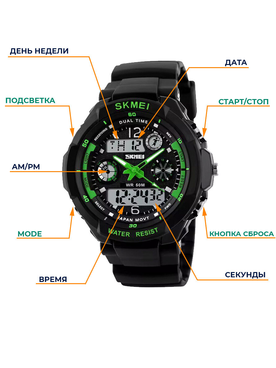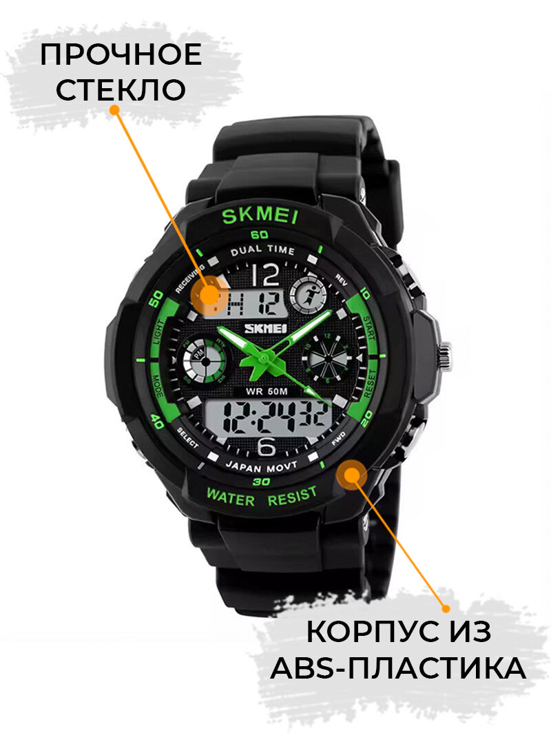 Часы наручные мужские электронные спортивные SKMEI водонепроницаемые, с будильником и секундомером, черные/зеленые интересное: