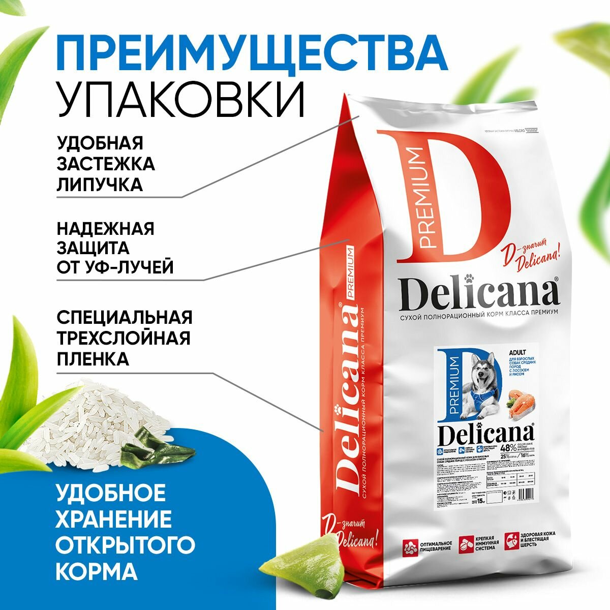 Сухой корм Delicana для взрослых собак средних пород, лосось с рисом, 15 кг