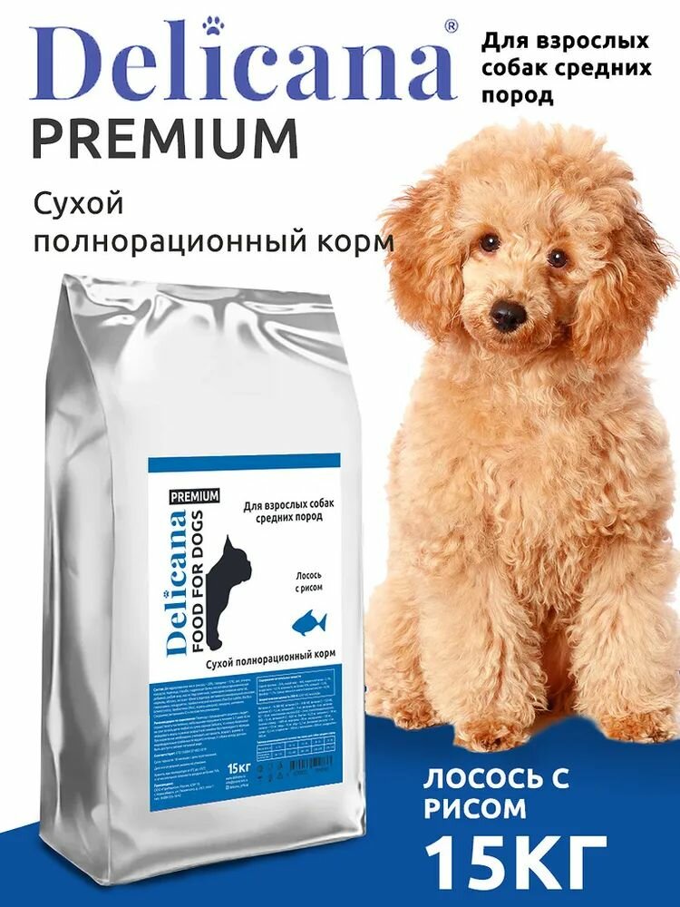 Купить Корм сухой Delicana для собак средних пород Лосось с рисом, 15 кг