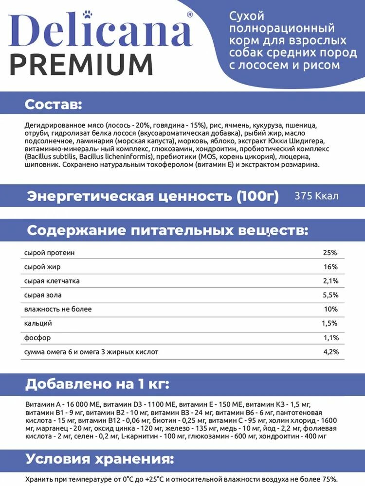 Ниже Вы можете прочитать отзывы на Корм сухой Delicana для собак средних пород Лосось с рисом, 15 кг, ознакомится с подробными характеристиками, посмотреть интересные обзоры и фотографии на Корм сухой Delicana для собак средних пород Лосось с рисом, 15 кг.
