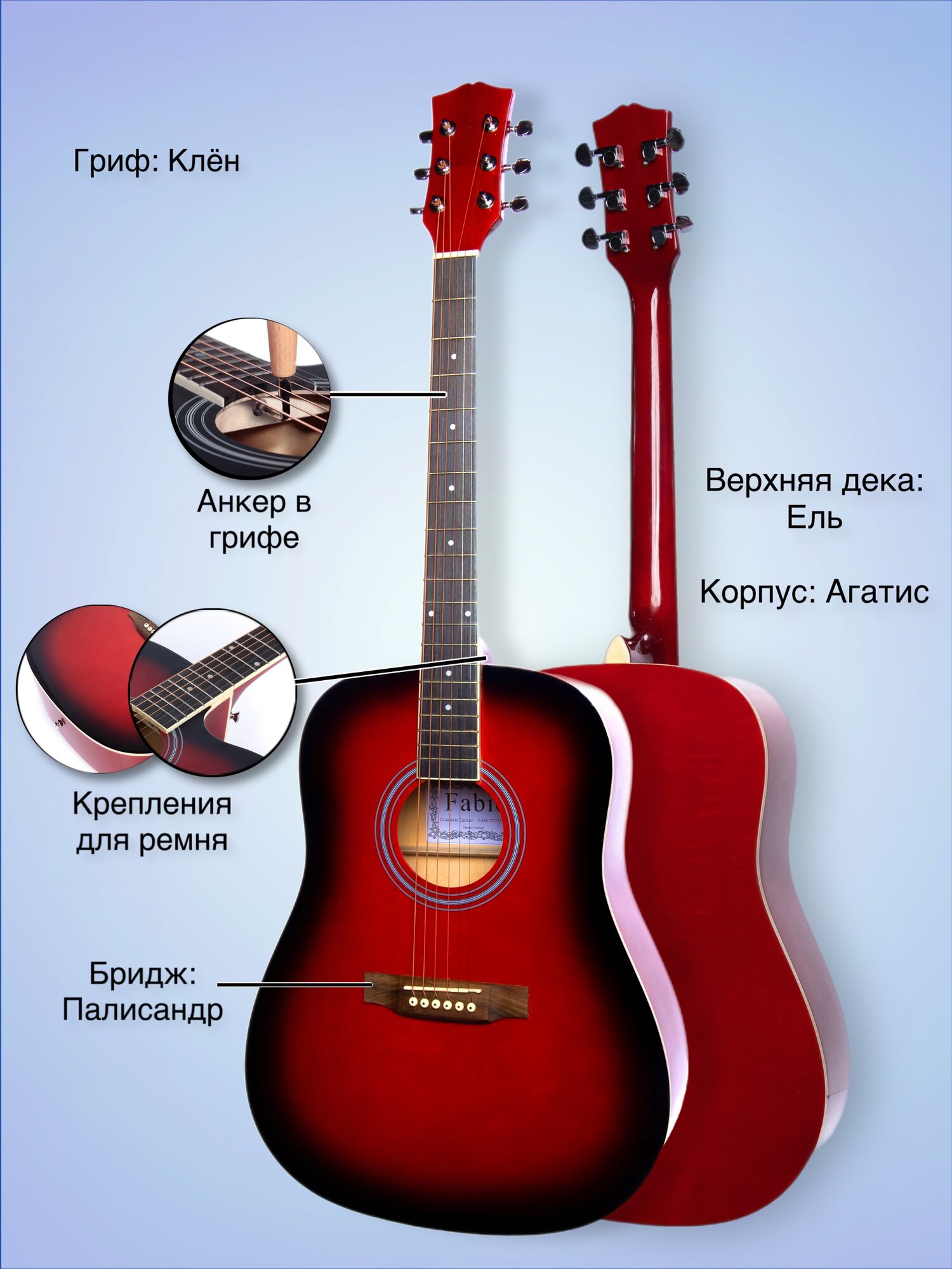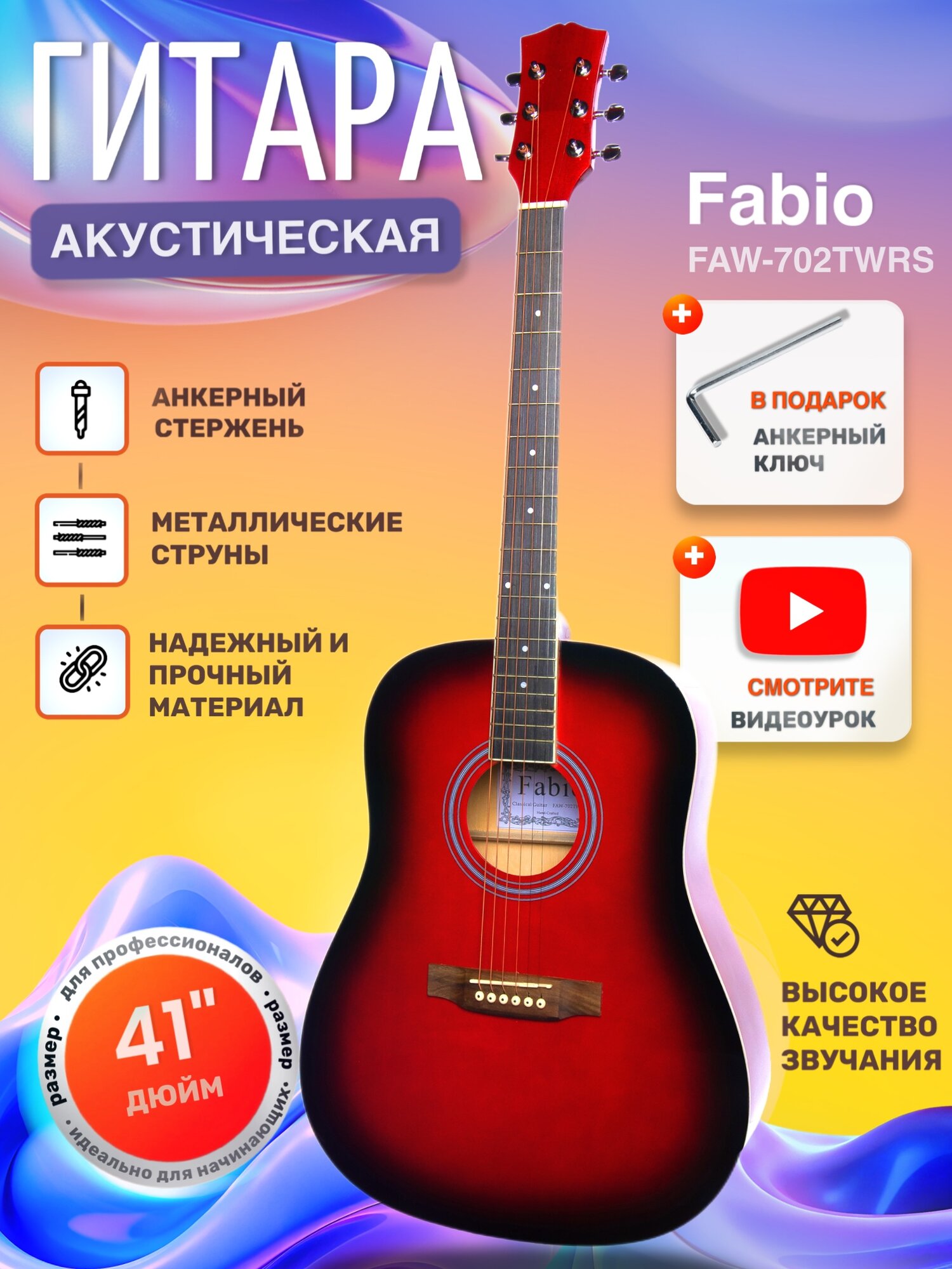 Акустическая гитара Fabio "Red Sunburst" FAW-702, drednought, 6 струн интересное: