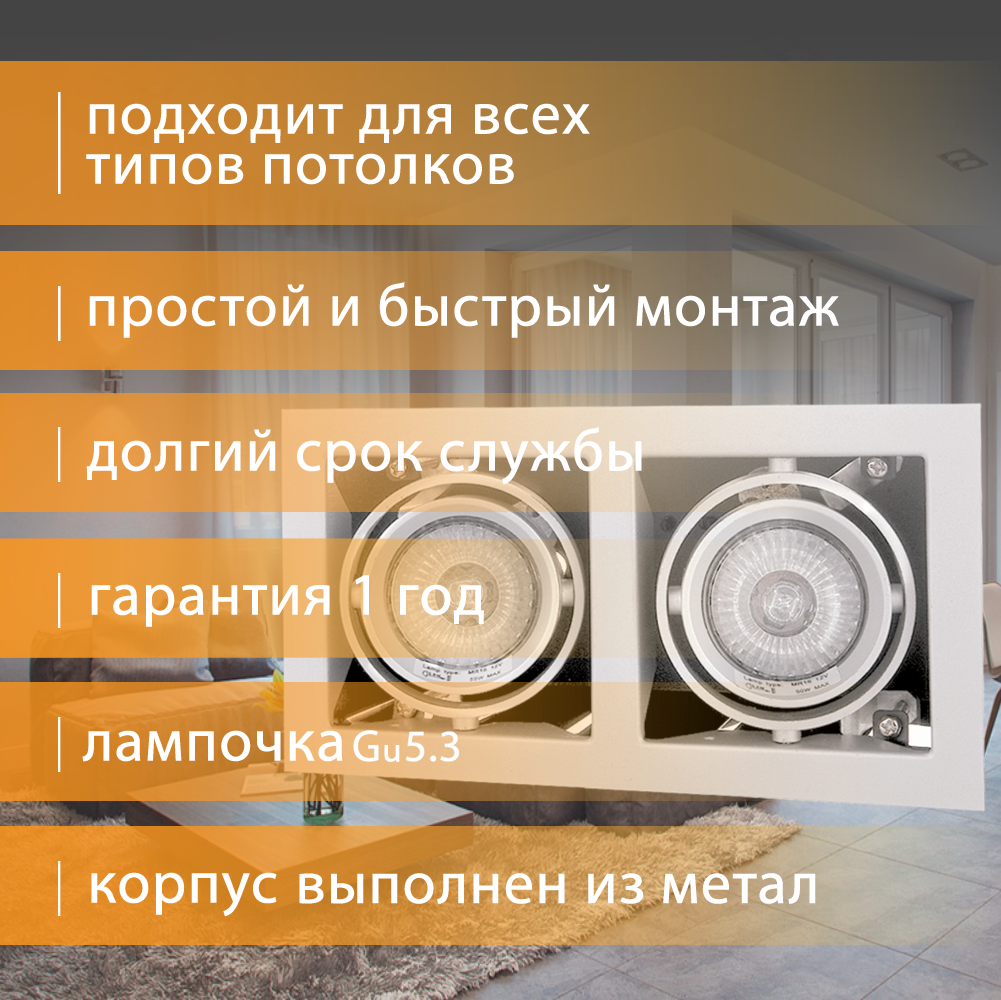 | Плюсы: | Компактный корпус под две лампы, металлическая арматура, пружинное крепление |