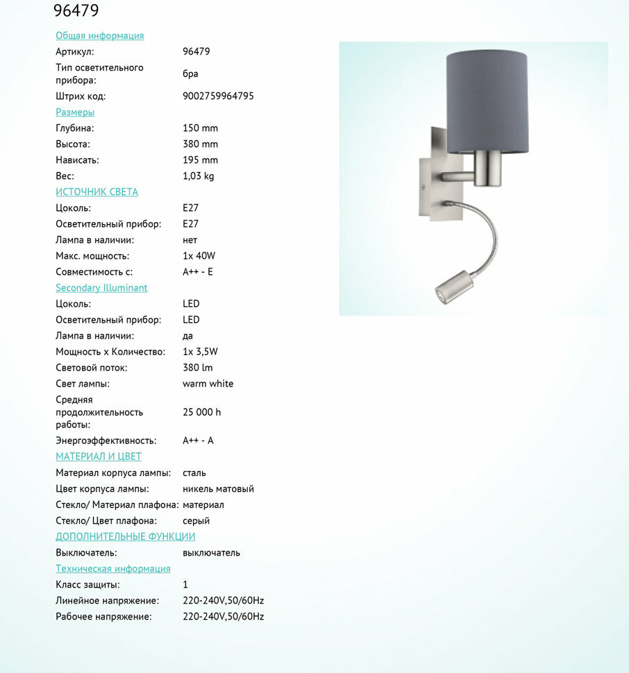 Ниже Вы можете прочитать отзывы на Бра EGLO Pasteri 96479, E27, 43.5 Вт, кол-во ламп: 2 шт., серый, ознакомится с подробными характеристиками, посмотреть интересные обзоры и фотографии на Бра EGLO Pasteri 96479, E27, 43.5 Вт, кол-во ламп: 2 шт., серый.