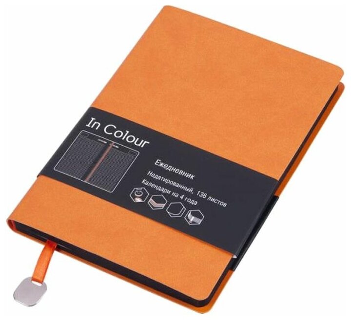 Купить Ежедневники А5. Недатир. 136л. Иск. кожа. Интегральн. (IN COLOUR). Бум. оф.70г/м2, тонир., 1кр. Скруглен.угол. Ляссе с подвеской. Инд.уп. Уп./гофр. Оранжевый