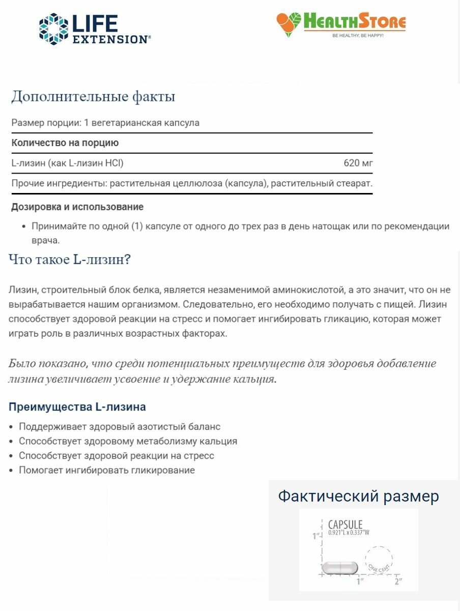 Life Extension L-Lysine 620 мг 100 капсул (Life Extension)