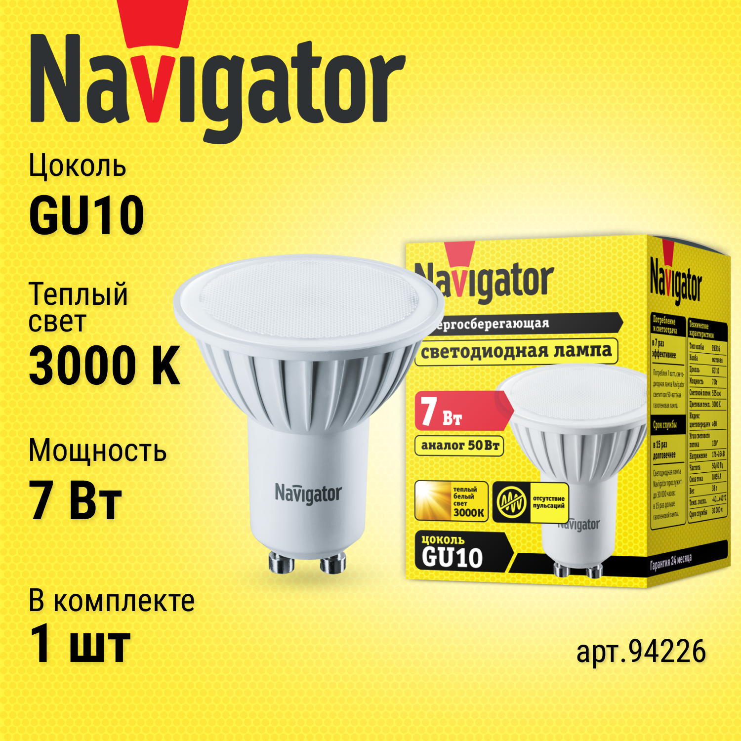 Лампа светодиодная Navigator 94 226, 7 Вт, цоколь GU10, теплый свет 3000К, упаковка 10 шт.