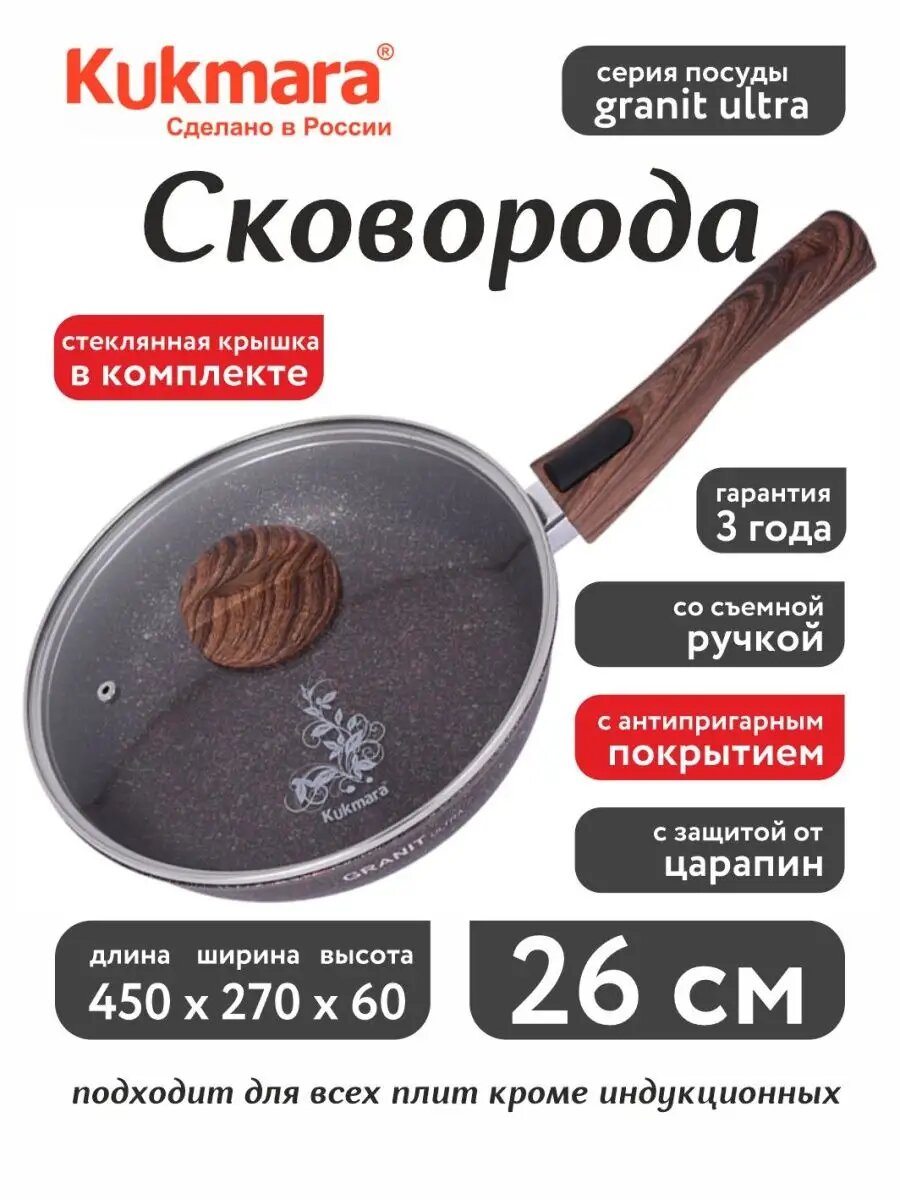 KUKMARA Сковорода Granit ultra, d26 см, стеклянная крышка, съёмная ручка, антипригарное покрытие