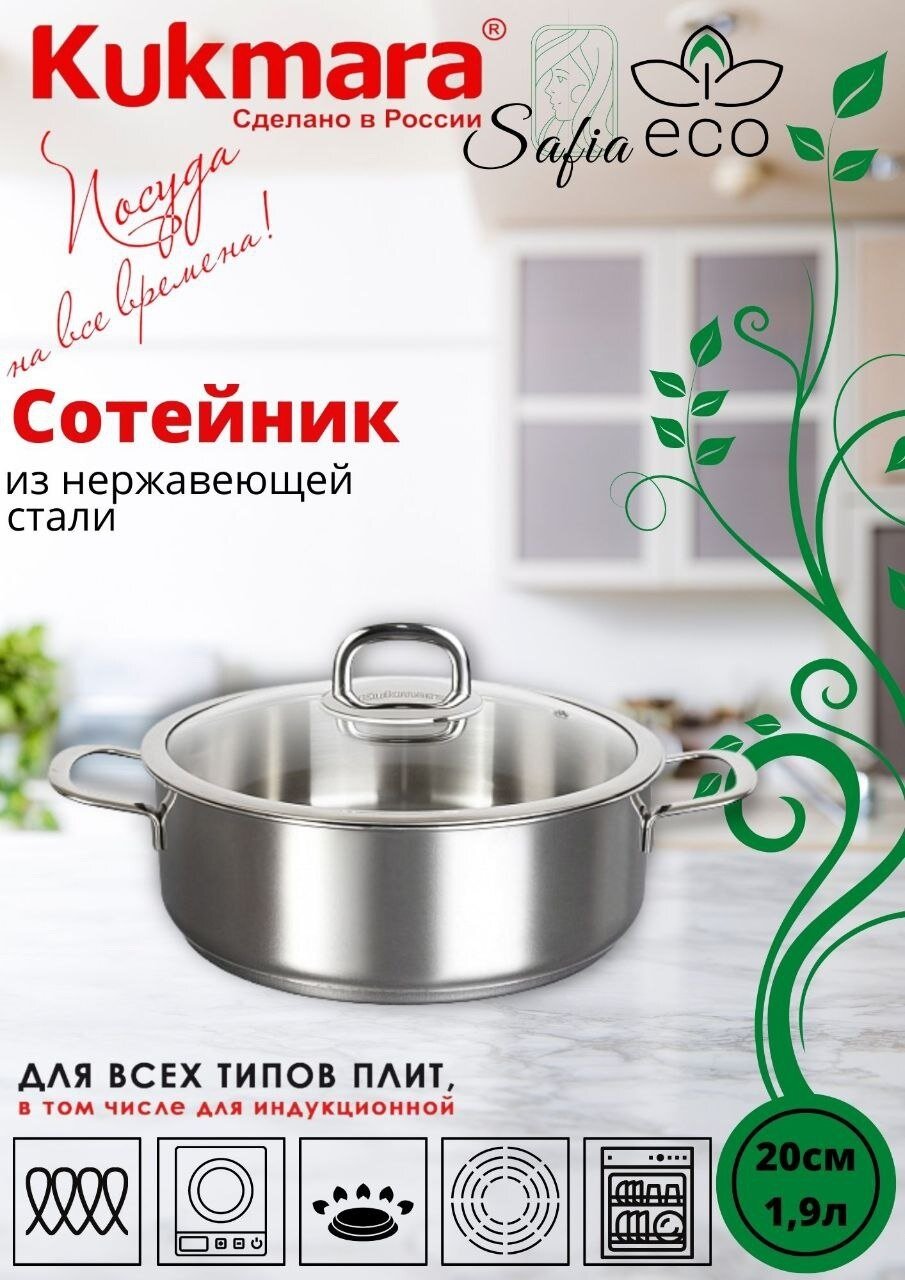 Сотейник Kukmara из нержавеющей стали 22 см со стеклянной крышкой, линия "Safia", 2.4 л
