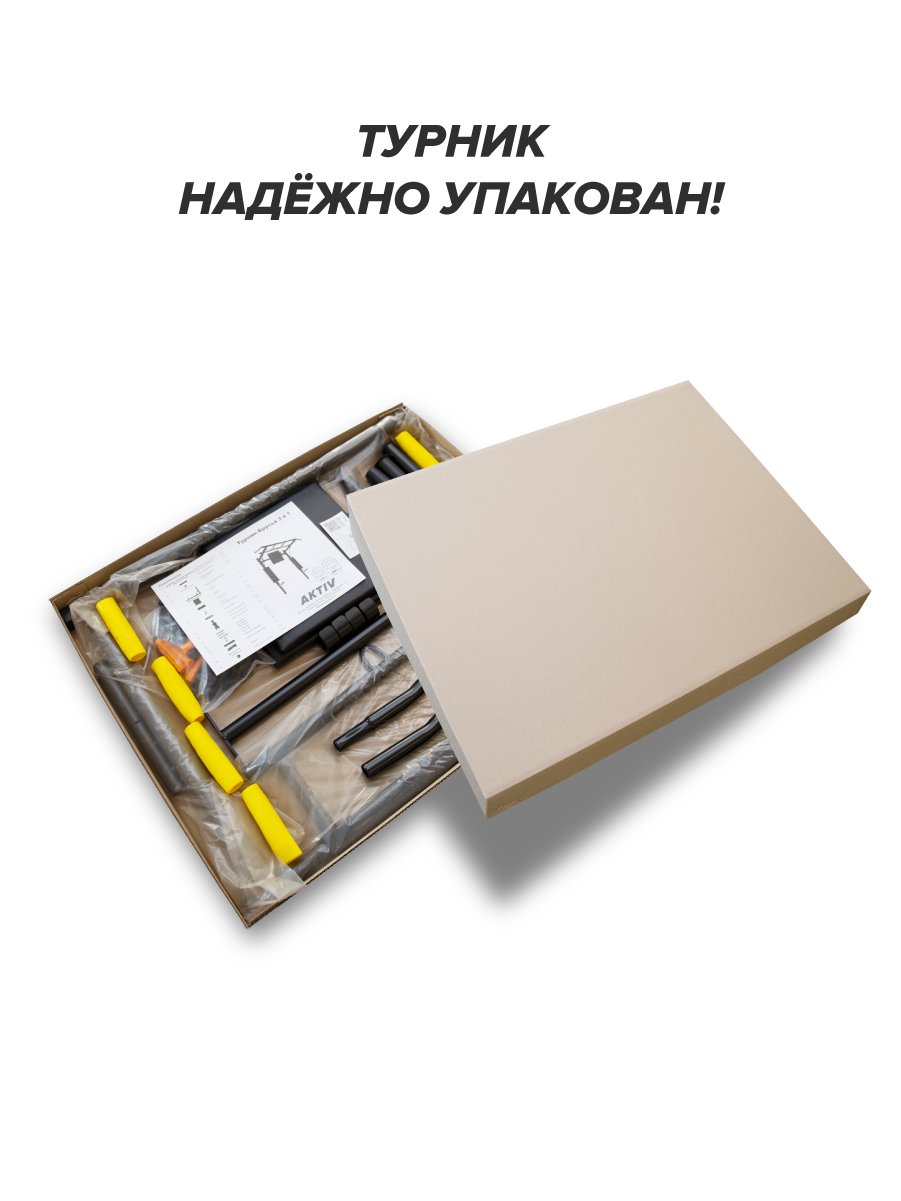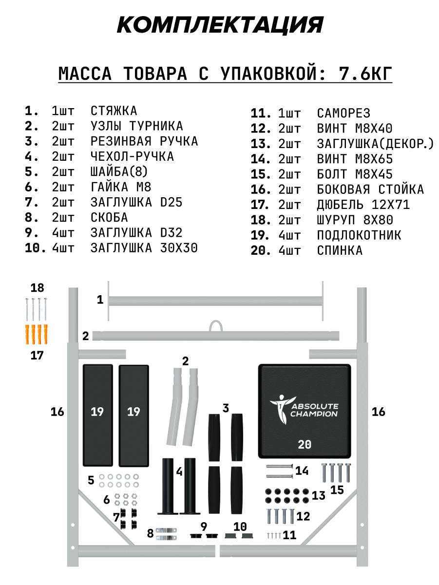 | Дополнительная информация | Комплектация: Турник-1 шт., ручка турника-4 шт., боковая стойка-2 шт., стяжка-1 шт., спинка-1 шт., подлокотник-2 шт., саморез-4 шт., скоба двухлапковая-2 шт., заглушка круглая D25-4 шт., заглушка квадратная 30х30-2 шт., заглушка круглая ø 32 мм-2 шт., болт M8x45-4 шт., винтM8x50-4 шт., винт М8х65-2 шт., шайба М8-10 шт., гайка М8-6 шт., ручка-чехол брусьев-2 шт., крепежный кронштейн -4 шт., крепеж-8 шт., декоративный колпачок-10 шт. |
