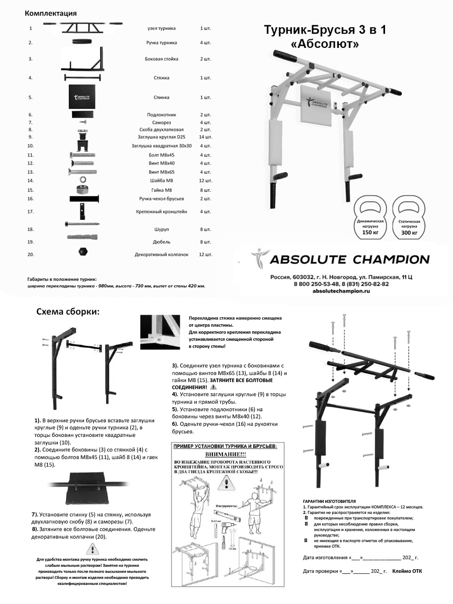 | Дополнительная информация | Комплектация: узел турника-1шт, ручка турника-4шт, боковая стойка-2шт, стяжка-1шт, спинка-1шт, подлокотник-2шт, саморез-4шт, скоба двухлапковая-2шт, заглушка круглая D25-14шт, заглушка квадратная 3х30-4шт, болт М8х45-4шт, винт М8х40-4шт, винт М8х65-4шт, шайба М8-12шт, гайка М8-8шт, ручка-чехол брусьев-2шт, крепежный кронштейн-4шт, шуруп-8шт, дюбель-8шт, декоративный колпачок-12шт |