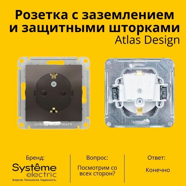 СохранитьРозетка электрическая Systeme Electric Atlas Design с заземлением и с защитными шторками, 16А Мокко ATN000645 - 4 шт. интересное: