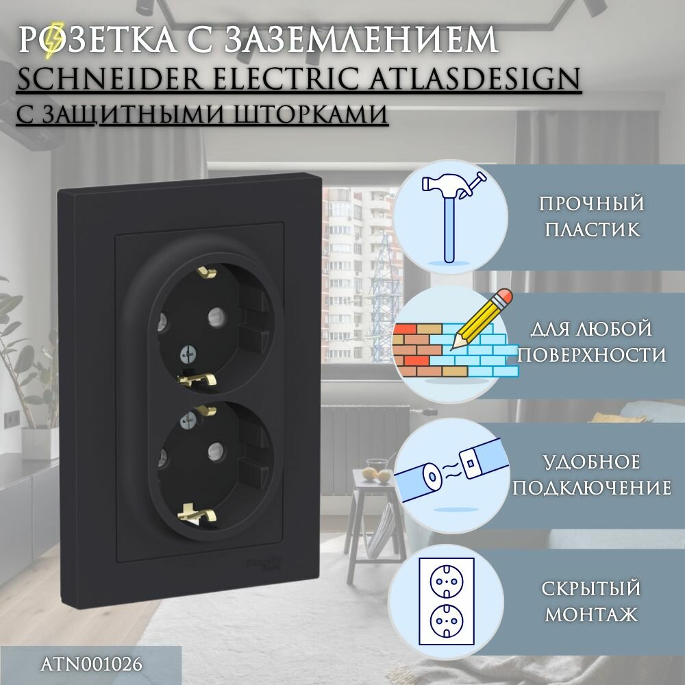 Розетка двухместная ATLASDESIGN, скрытый монтаж, с заземлением, карбон | код. ATN001024 | Schneider Electric (2шт. в упак.)
