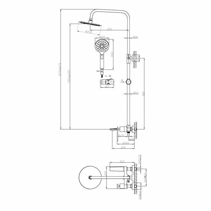 MOMENTO-CD-01 Душевая стойка со смесителем для верхнего и ручного душа, хром