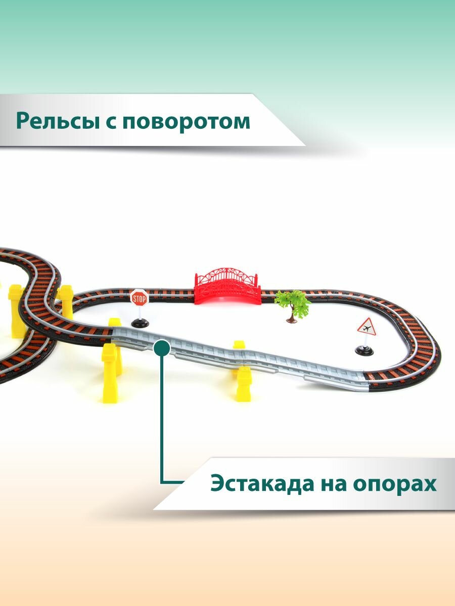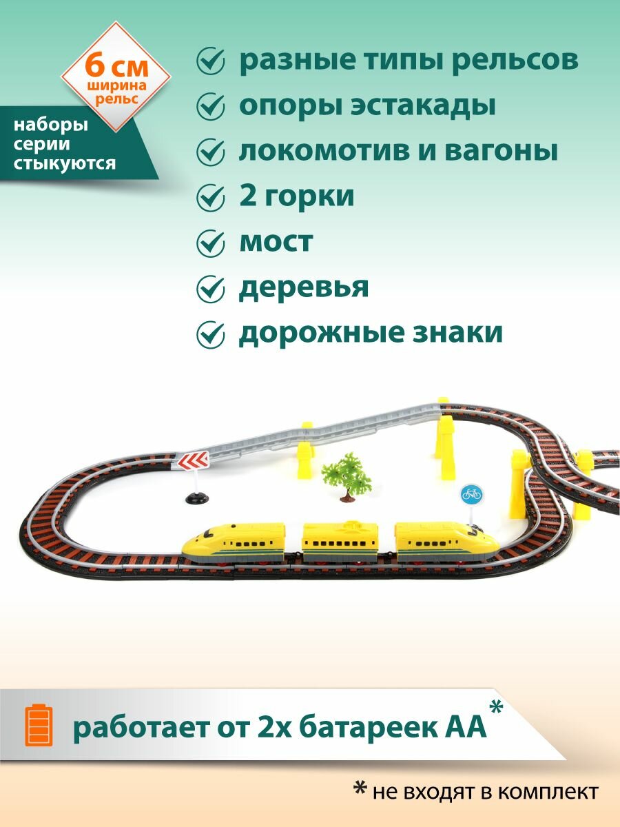 | Дополнительная информация | размеры собранной железной дороги: 155х50х11 см; размеры локомотивчика без учета сцепки: 14х4,5х5,5 см; длина собранного поезда: 43 см; ширина рельс: 6,5 см Высота деревца: 8 см. |
