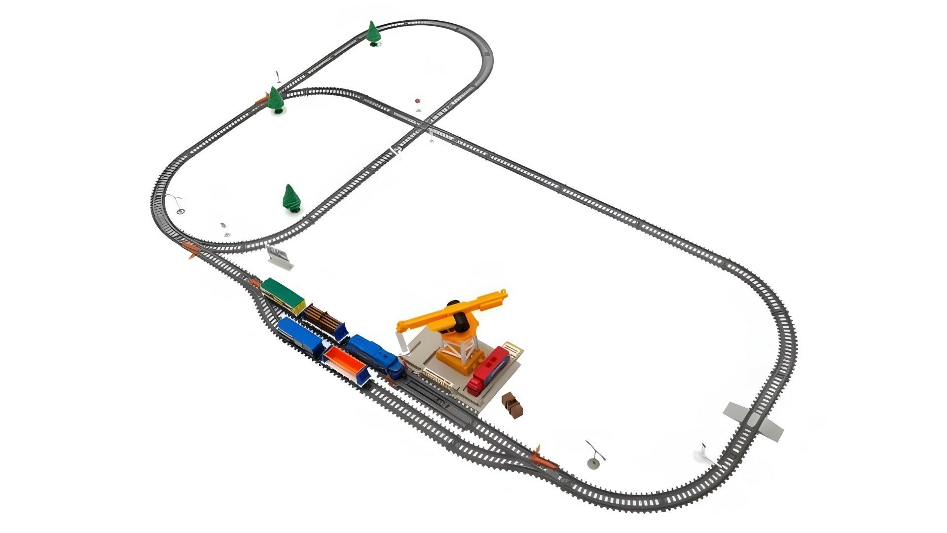 | Подробная комплектация | локомотив, 4 вагона, 2 радиальных стрелок, 2 прямых стрелок, грузовой башенный кран, модуль автоматической остановки локомотива, рельсовый перекресток, набор аксессуаров, набор рельсов |