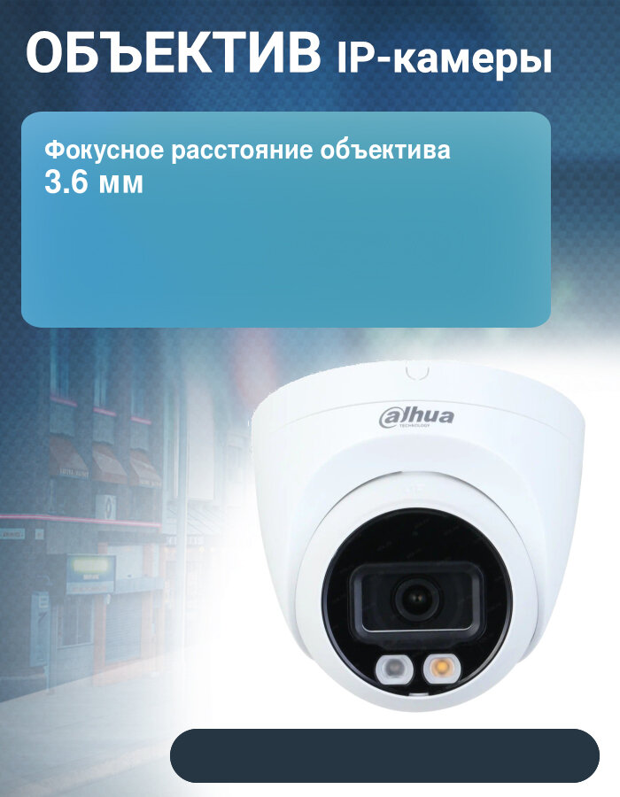 Dahua Видеонаблюдение DAHUA Уличная купольная IP-видеокамера Full-color с ИИ2Мп; 1/2.8” CMOS; объектив 3.6мм; WDR(120дБ); чувствительность 0.002лк@F1.6 сжатие: H.265+, H.265, H.264+, H.264, MJPEG; 2 потока до 2Мп@25к/с; в