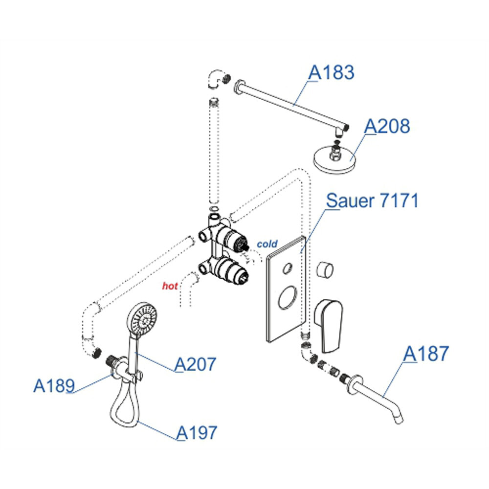 | Комплектация | смеситель для ванны и душа Sauer 7171 - 1 шт / подключение шланга A189 - 1 шт / шланг для душа A197 - 1 шт / верхняя душевая насадка A208 - 1 шт / настенный верхний излив для душа A183 - 1 шт / лейка A207 - 1 шт / настенный излив для ванны A187 - 1 шт |