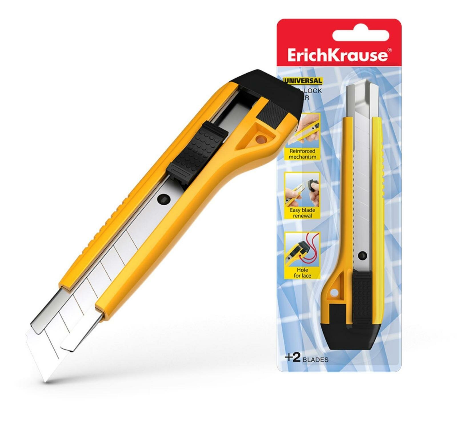 Нож канцелярский 18мм ERICH KRAUSE Universal, 2 запасных лезвия, желтый