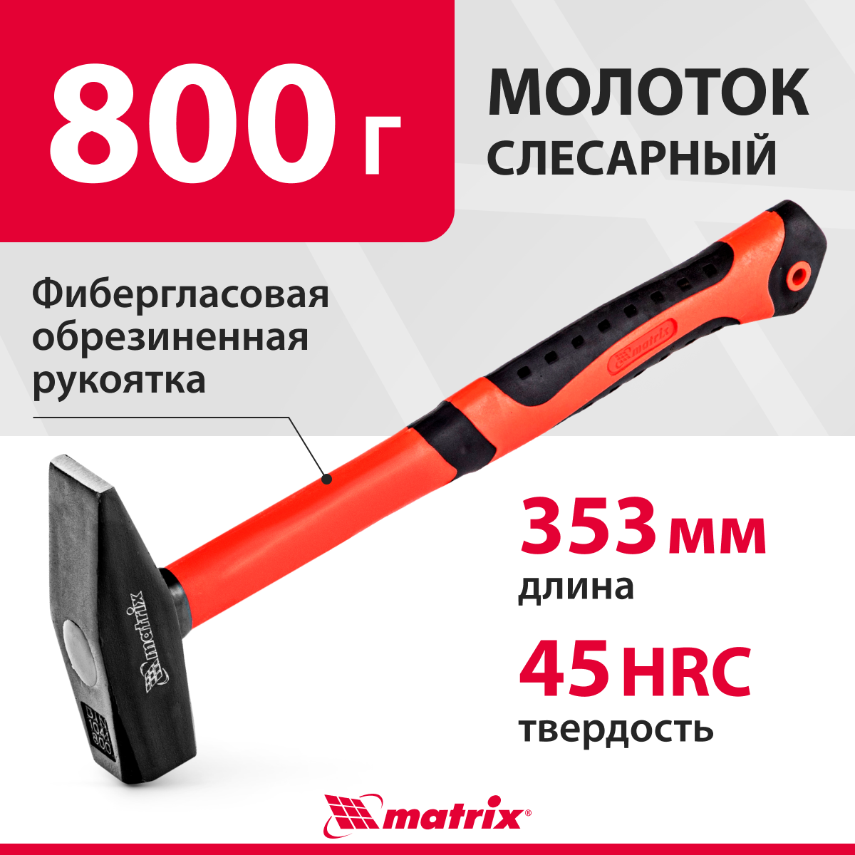Молоток слесарный Matrix, фиберглассовая обрезиненная рукоятка, 800 г
