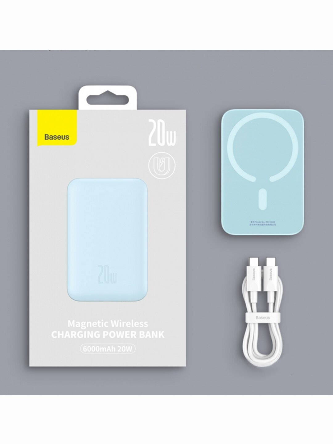 Внешний магнитный беспроводной аккумулятор BASEUS Magnetic Mini, 10000 mAh, 20W, с кабелем Type-C to Type-C 50 см, Голубой, PPCX030003