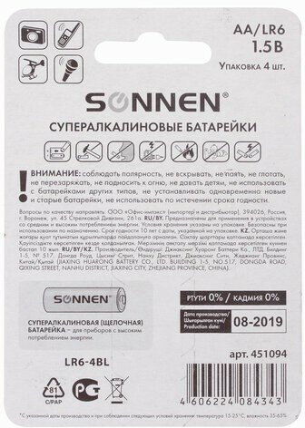 Батарейки SONNEN Super Alkaline, АА алкалиновые, 4 шт., в блистере, 451094