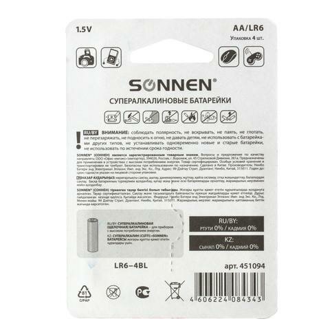 Ниже Вы можете прочитать отзывы на Элемент питания АА (LR6,15А) 4 шт., SONNEN Super Alkaline, алкалиновые, пальчиковые, блистер, ознакомится с подробными характеристиками, посмотреть интересные обзоры и фотографии на Элемент питания АА (LR6,15А) 4 шт., SONNEN Super Alkaline, алкалиновые, пальчиковые, блистер.