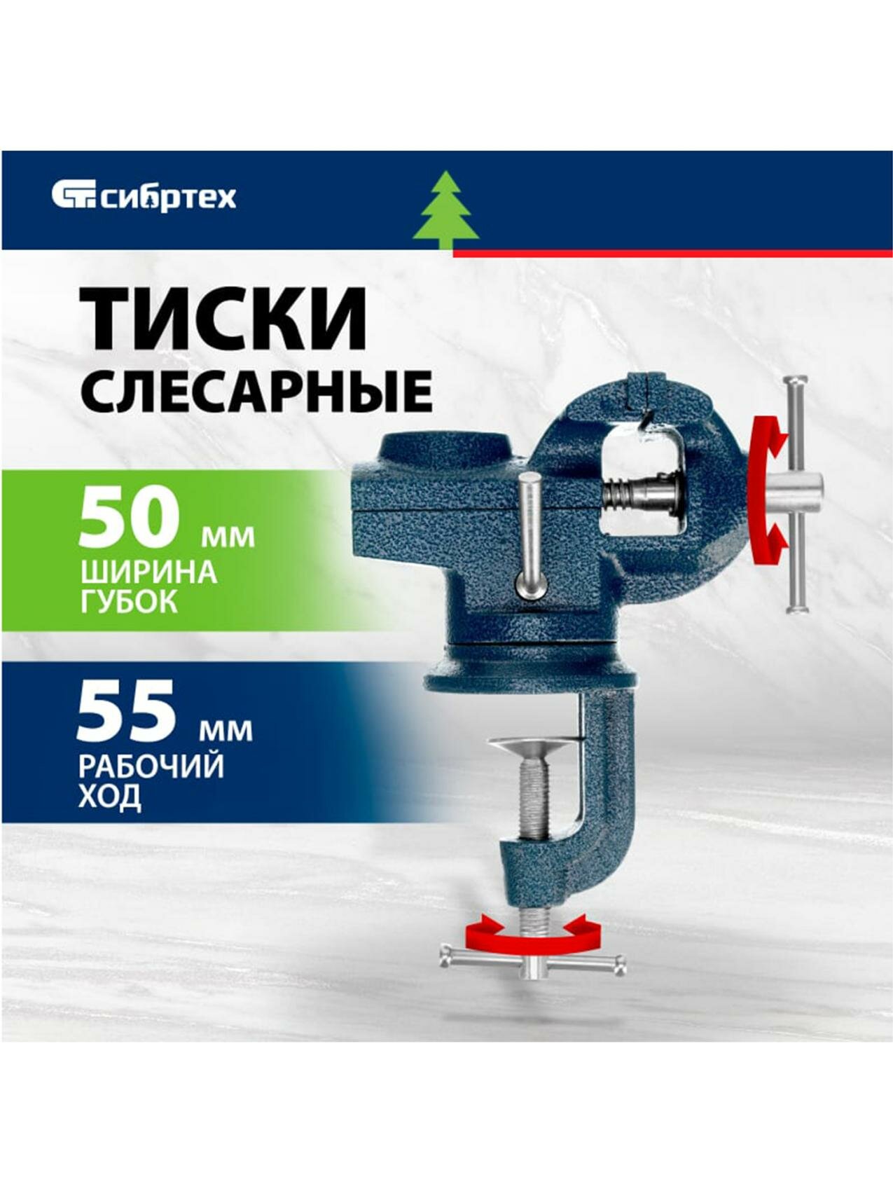Тиски слесарные Сибртех 18668 настольные, поворотные, ширина рабочих губок 50 мм, наковальня .
