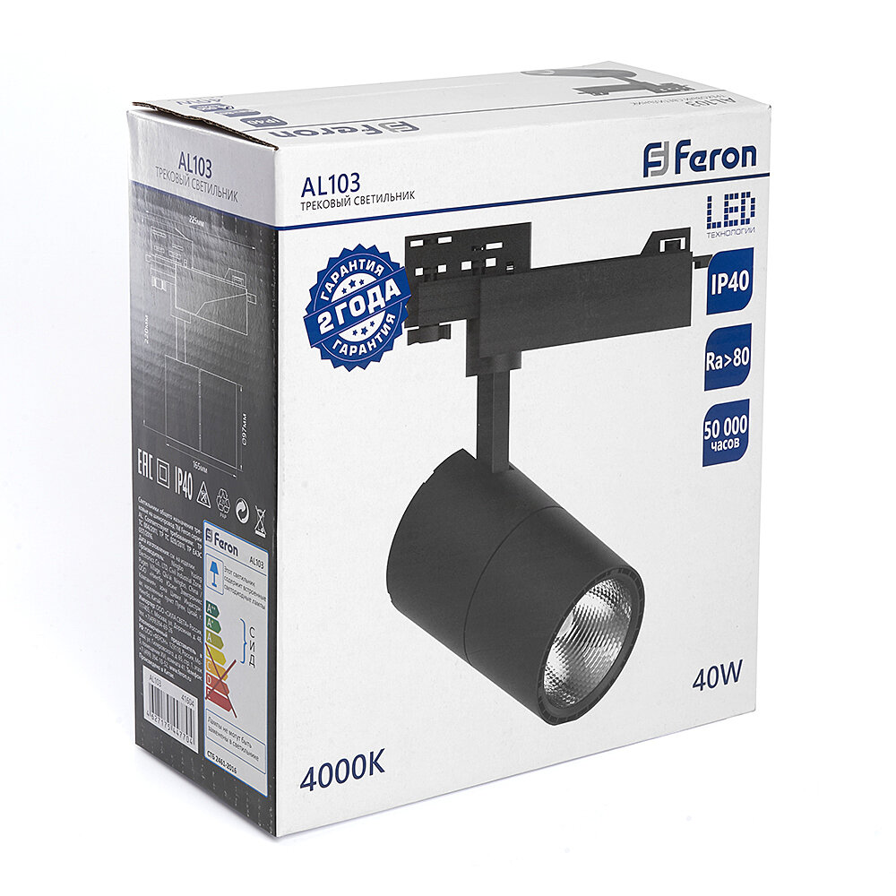 Светодиодный светильник AL103 трековый однофазный на шинопровод 40W 4000K, 35 градусов, черный, FERON 41183 (1 шт.)