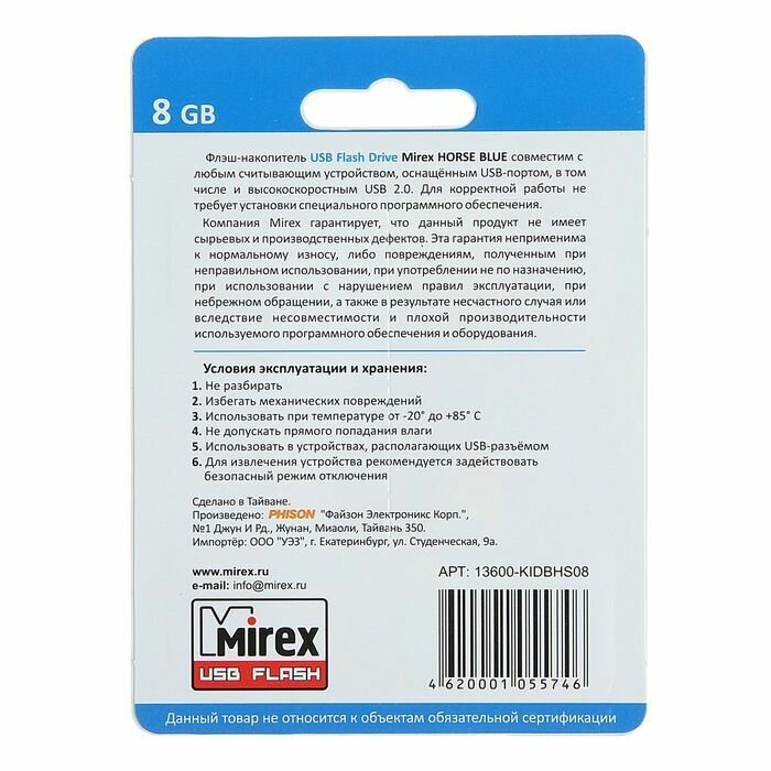 Накопитель USB 2.0 8GB Mirex HORSE 13600-KIDBHS08 BLUE (ecopack)