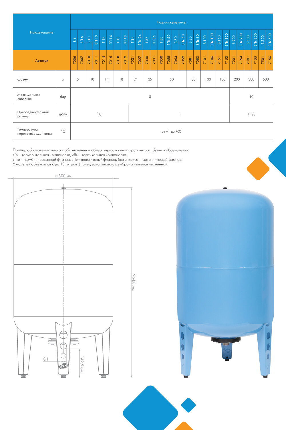 Гидроаккумулятор вертикальный ВП 150к, комбинированный фланец | код 7153 | Джилекс (1 шт.)