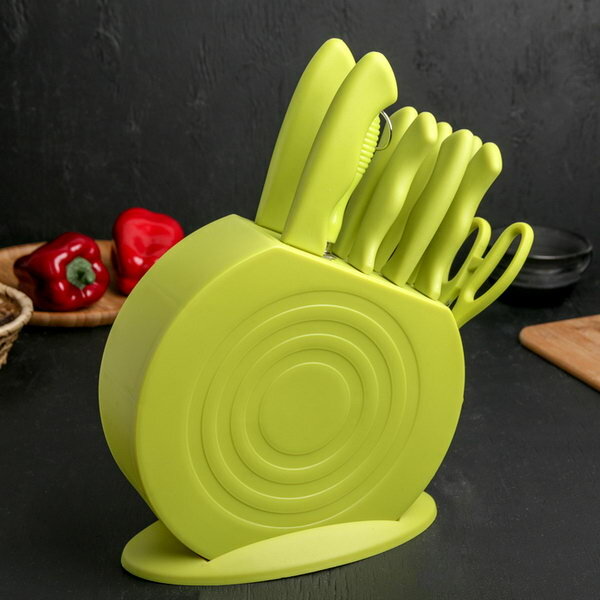 Купить Набор ножей кухонных на подставке, 8 ножей, ножеточка, ножницы, цвет зелёный