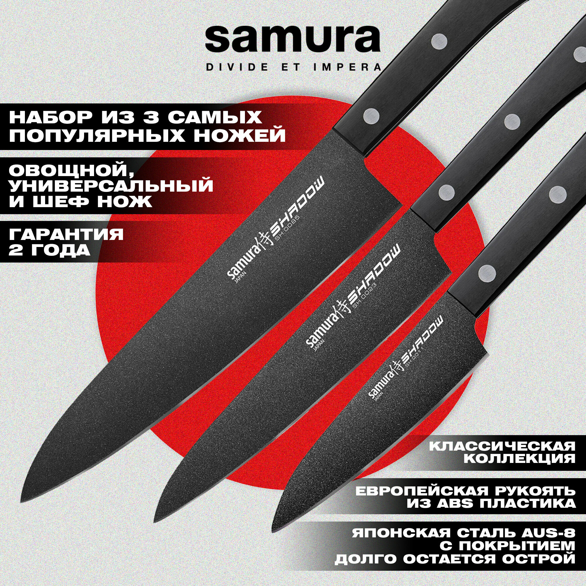Набор из 3 ножей Samura SHADOW с покрытием Black-coating (11,23, 85), AUS-8