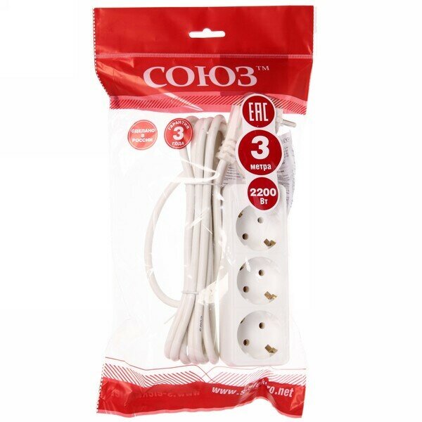 Удлинитель бытовой 3 гнезда, 3 м, ПВС, с заземлением, 2200 Вт, Союз, 481S-9303 интересное: