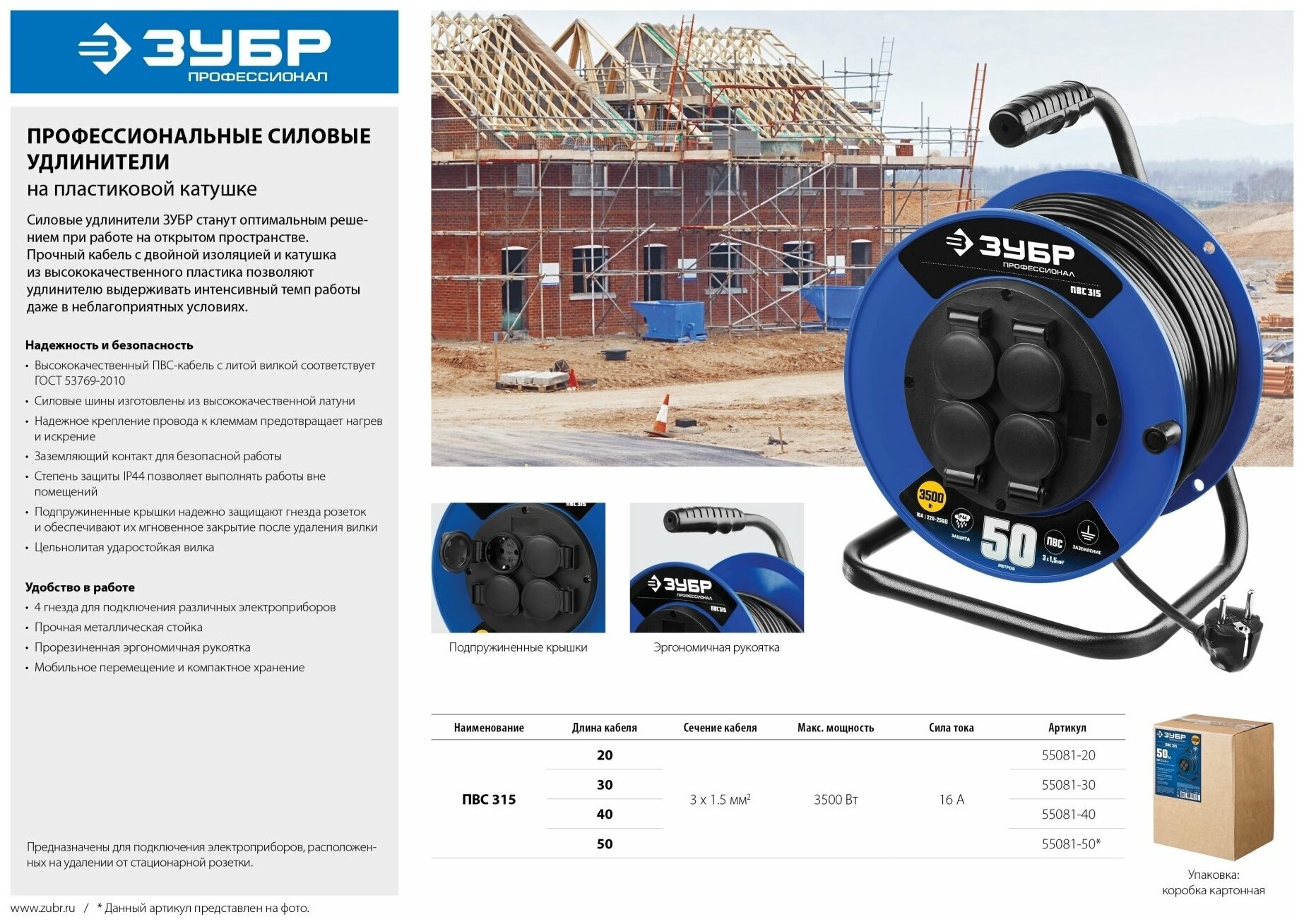 Ниже Вы можете прочитать отзывы на Удлинитель на катушке ПВС 315, 30 м, 3500 Вт, 4 гнезда, IP44, ПВС 3х1,5 кв мм, ЗУБР Профессионал арт.55081-30, ознакомится с подробными характеристиками, посмотреть интересные обзоры и фотографии на Удлинитель на катушке ПВС 315, 30 м, 3500 Вт, 4 гнезда, IP44, ПВС 3х1,5 кв мм, ЗУБР Профессионал арт.55081-30.