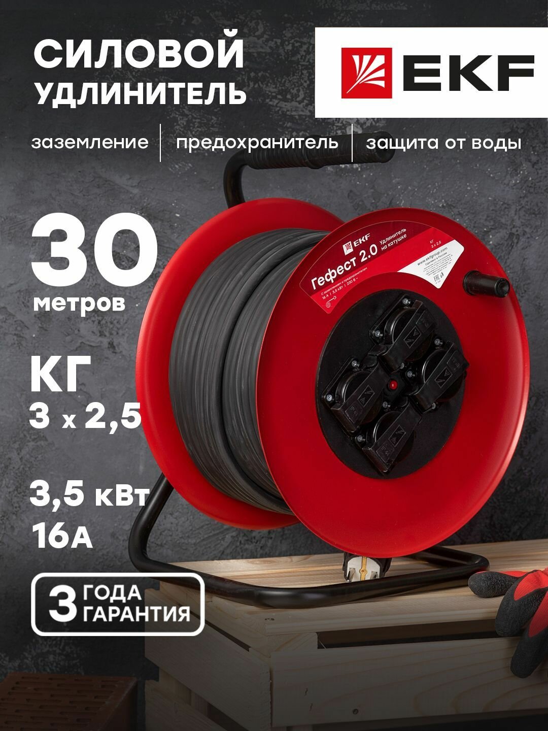 Удлинитель на катушке EKF Гефест PROxima UKG02-16-R325-4-30-IP44 2.0, 30 м, 4 розетки, 16А, с/з, КГ 3*2,5