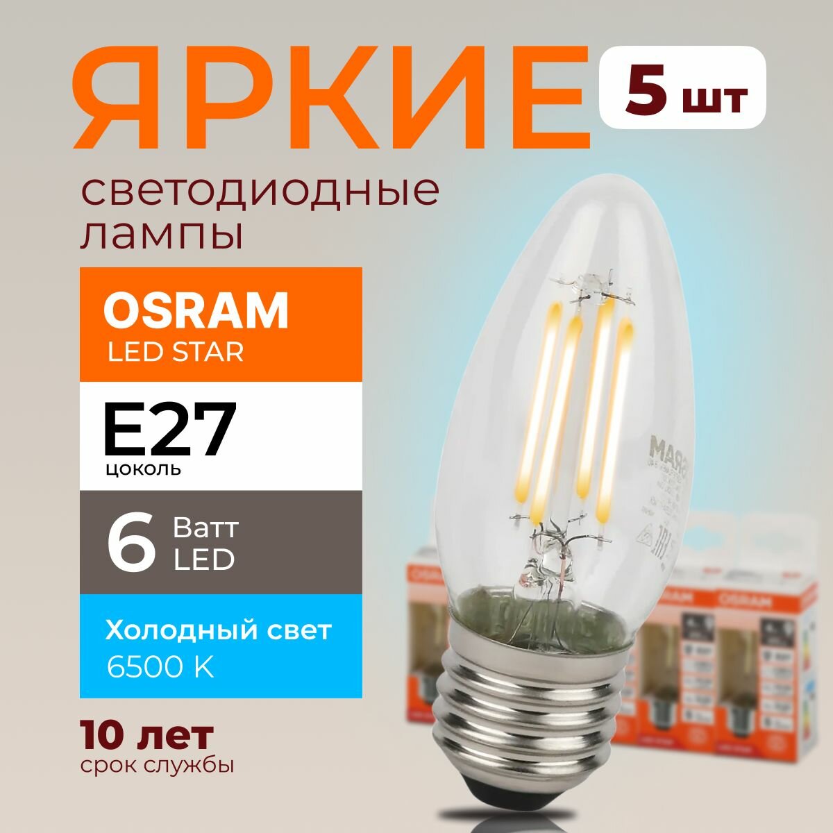 Купить 5 шт/уп. Лампа LED Шарик 6Вт 220-240В E27 806Лм 6500К Угол 300 град. d 45mm h 77mm Филаментная Стекло Свет Холодный белый Osram, уп. 5шт