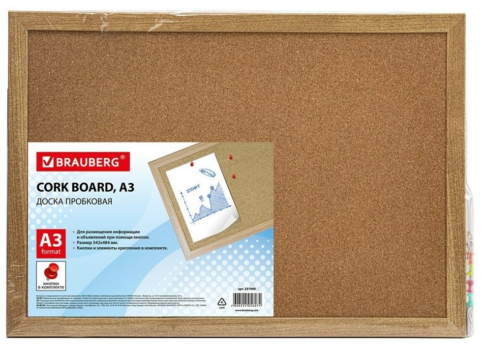 Доска пробковая для объявлений А3, 342х484 мм, гарантия 10 ЛЕТ, BRAUBERG, 231990 В комплекте: 1шт.