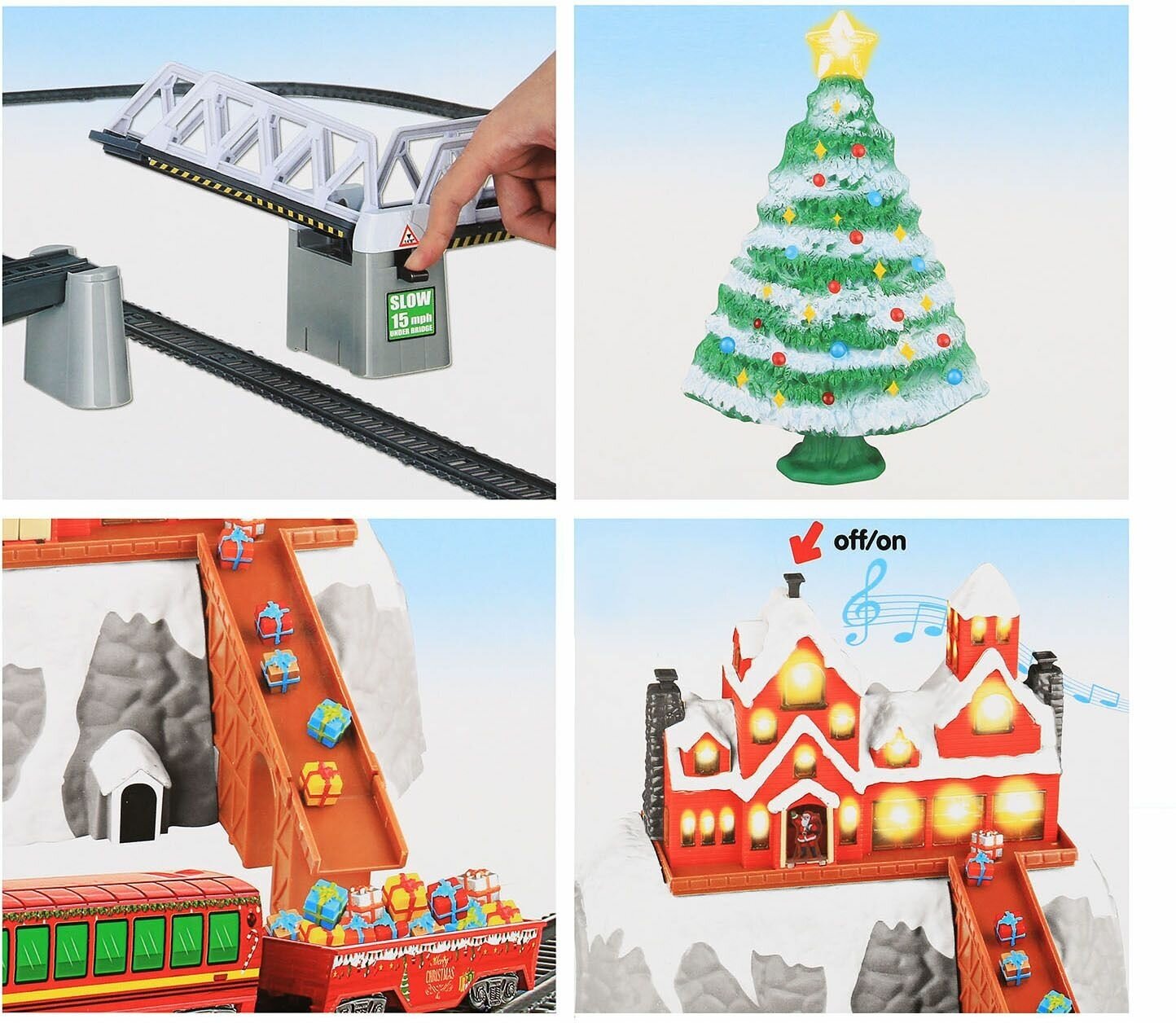 | Подробная комплектация | В комплекте 26 элементов: локомотив, 4 вагона, станция, новогодняя елка, мост, музыка, свет. |