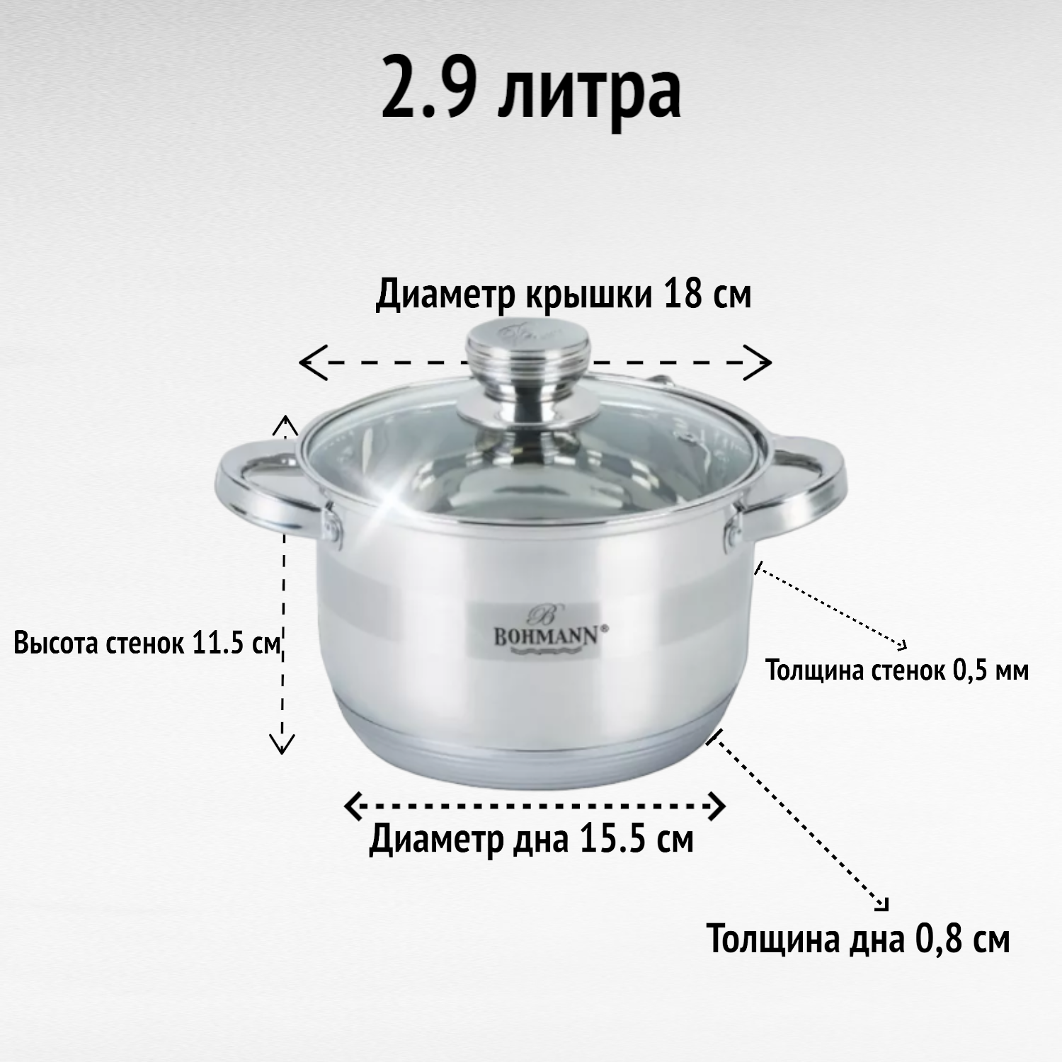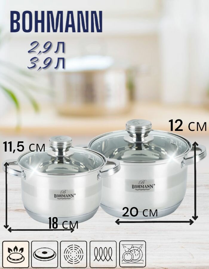 BOHMANN BH 04-275, Набор кастрюль 4 предмета ( 2,9 л; 3,9 л со стеклянными жаропрочными крышками)