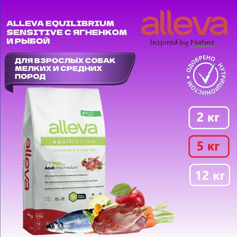 Сухой корм для собак ALLEVA EQUILIBRIUM SENSITIVE LAMB AND OCEAN FISH ADULT MINI/MEDIUM Аллева Корм для взрослых собак мелких и средних пород Эквилибриум Сенситив с ягненком и океанической рыбой 2 кг
