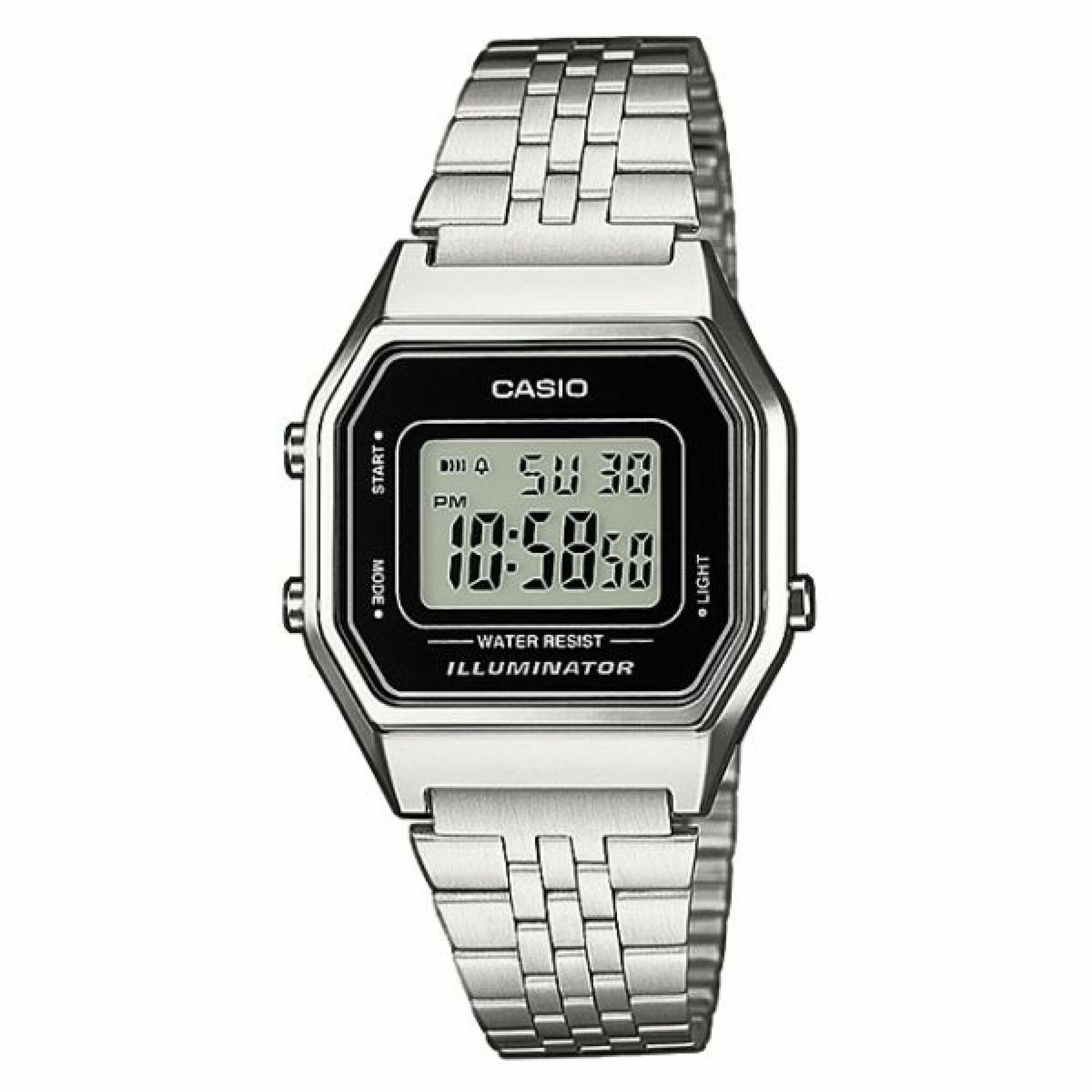 LA680WEA-1E Casio наручные часы кварцевые WR30 (3 атм) женские серебряный секундомер будильник отображение дня недели, отображение числа подсветка дисплея акриловое стекло