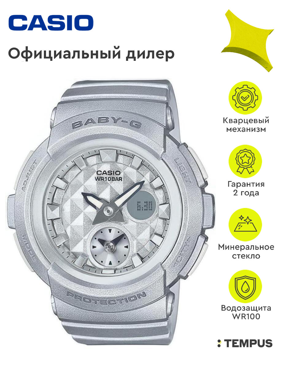 Наручные часы CASIO BGA-195-8A женские, кварцевые, будильник, хронограф, секундомер, таймер обратного отсчета, водонепроницаемые, противоударные, подсветка стрелок, подсветка дисплея, серебряный