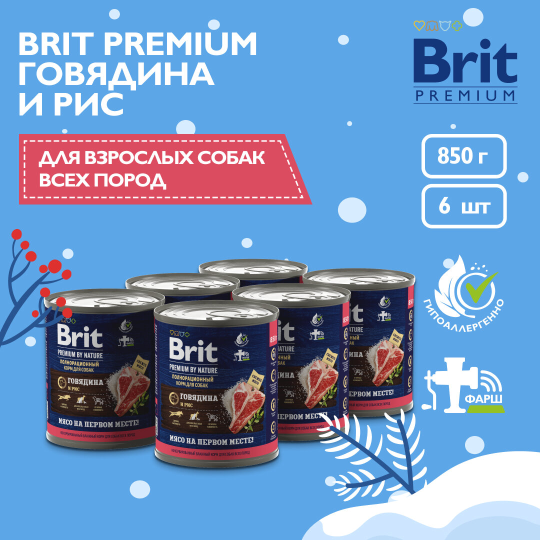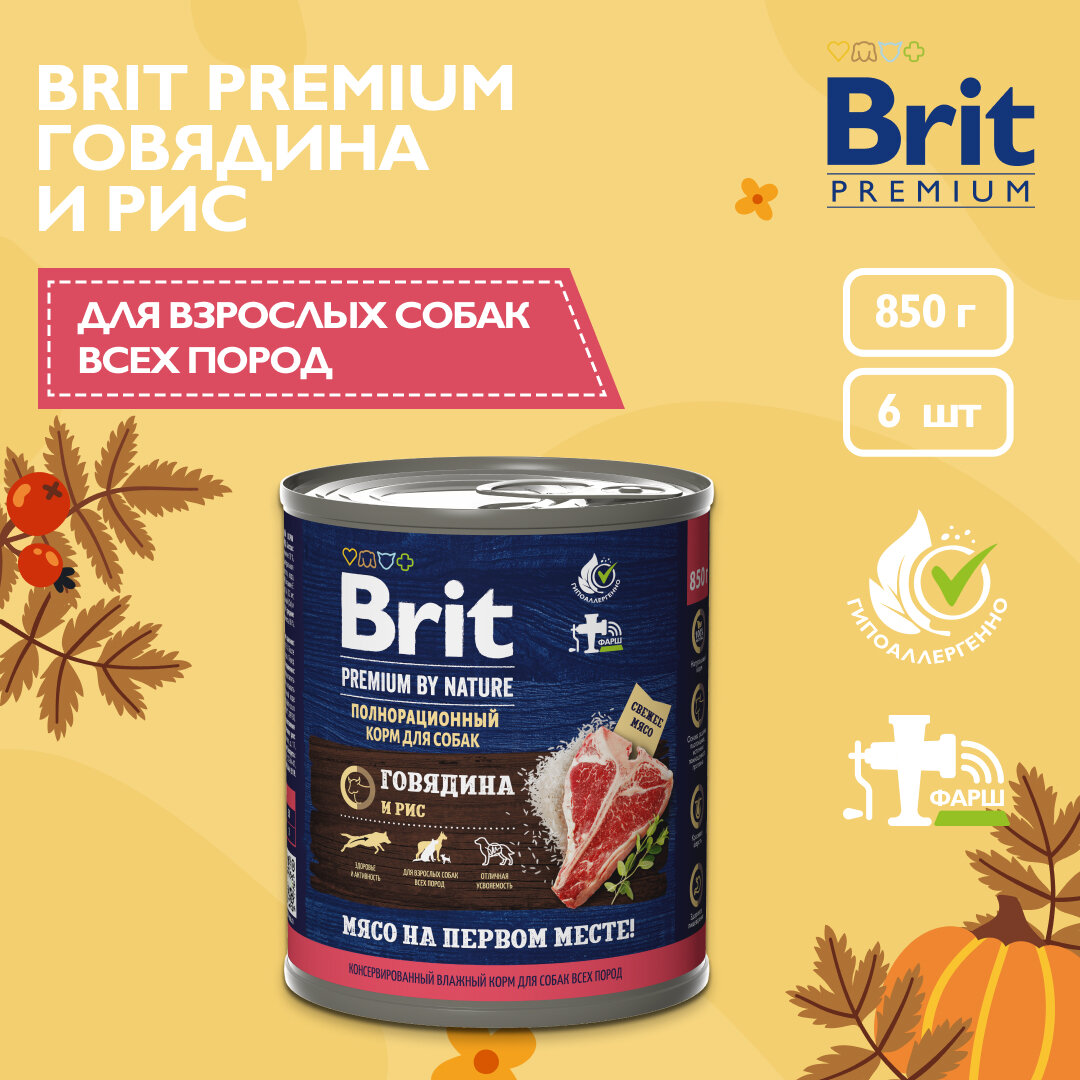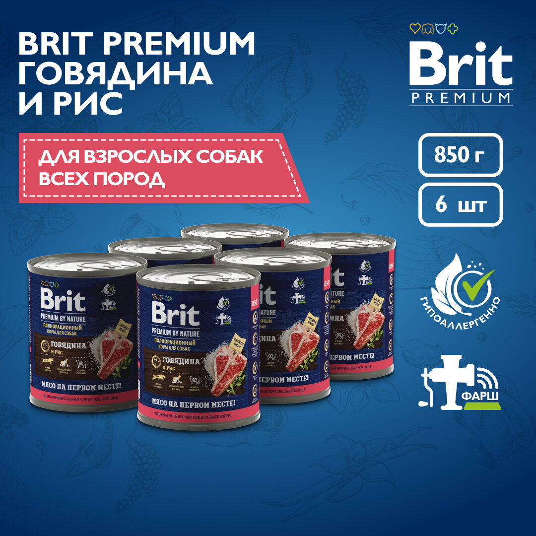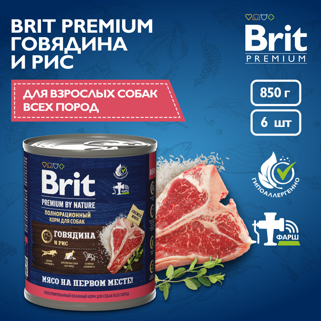 Brit Premium by Nature полнорационный влажный корм для собак, фарш из говядины с рисом, в консервах - 850 г х 6 шт