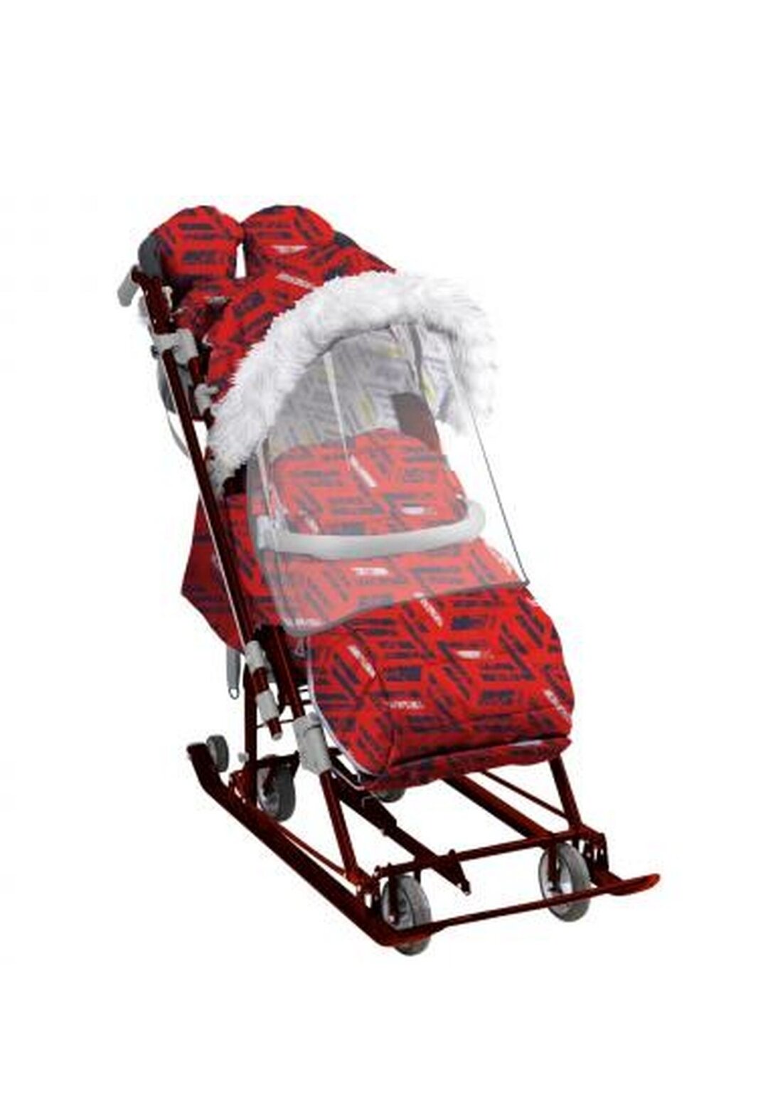 | Дополнительная информация | козырек с меховой окантовкой (мех – шерстяной мех), подножка для ног с регулируемым углом наклона, светоотражающий кант, смотровое окошко для наблюдения за ребенком, съемный прозрачный тент от ветра и дождя, обрезиненные колеса на полозьях; Размер в сложенном виде - 122 х 45.5 х 32 см |