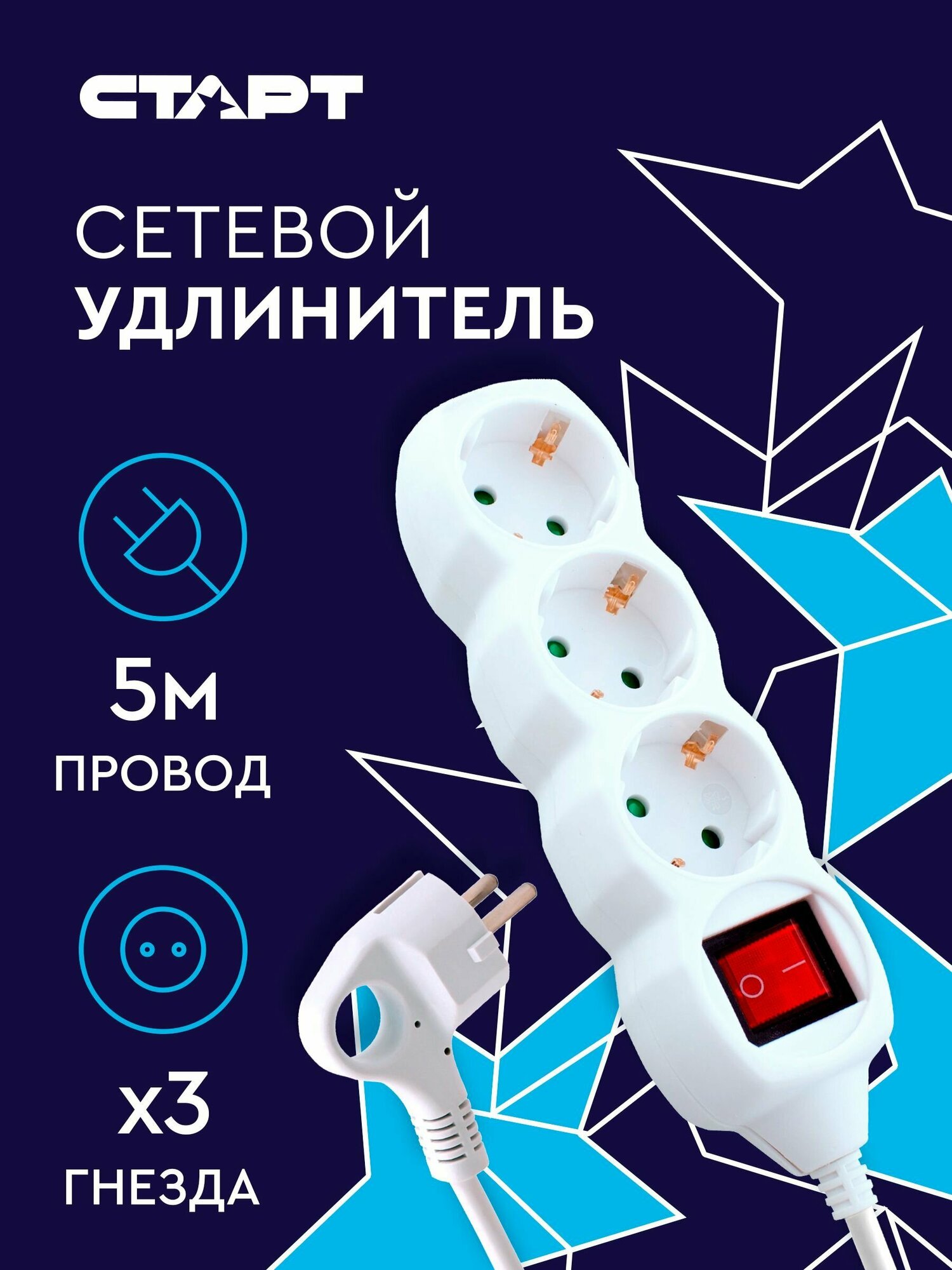 Купить Удлинитель сетевой бытовой с заземлением 5м старт 3 розетки с выключателем и защитой от детей, 10А, ПВС 3х0.75, 2200 Вт