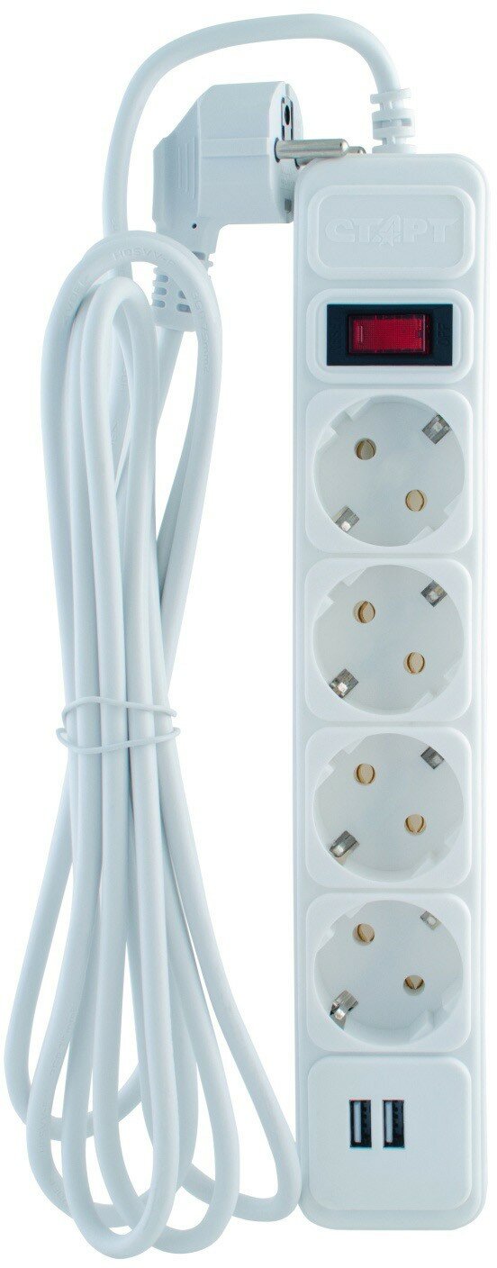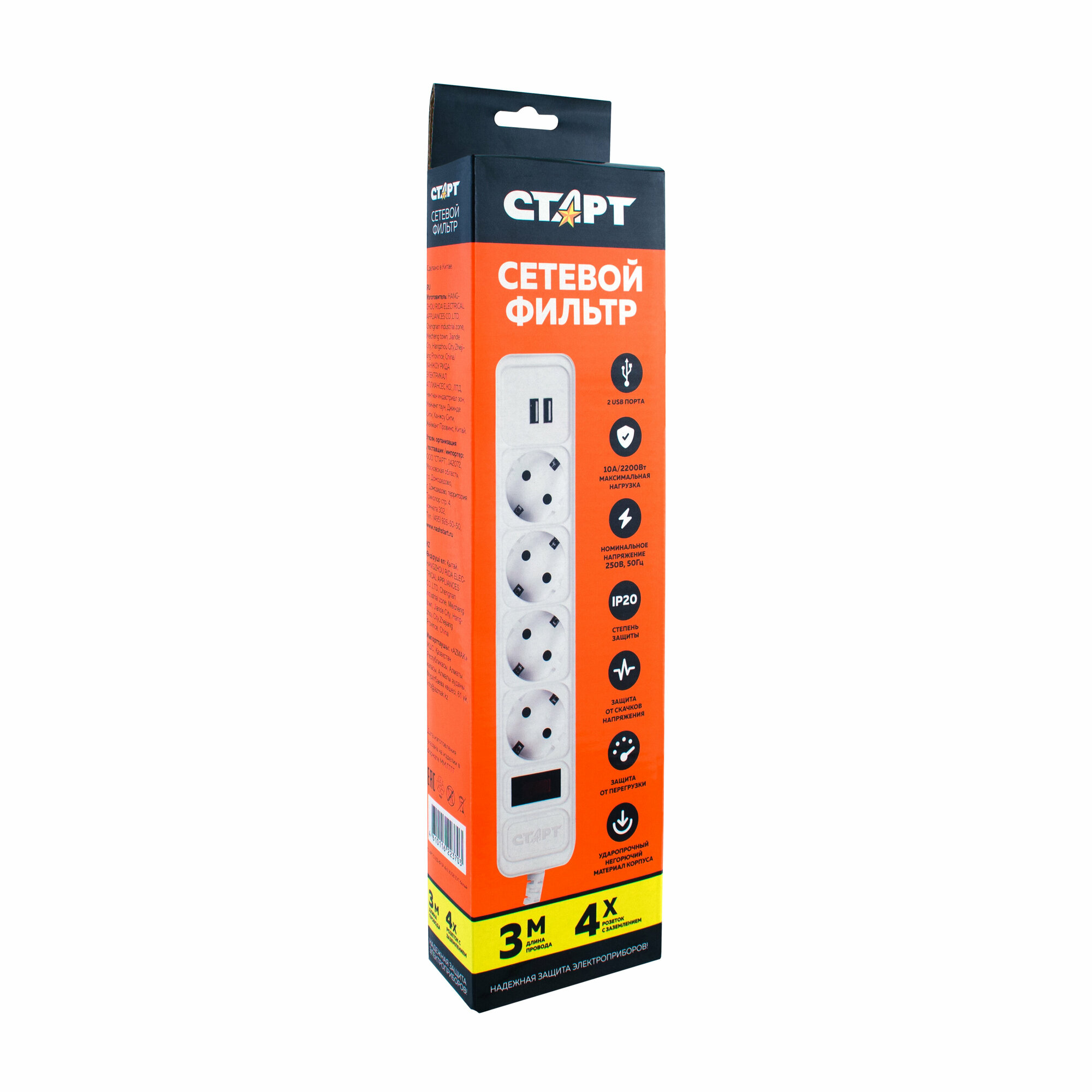 Купить Удлинитель Старт белый, 4 розетки, 3 м, 2USB