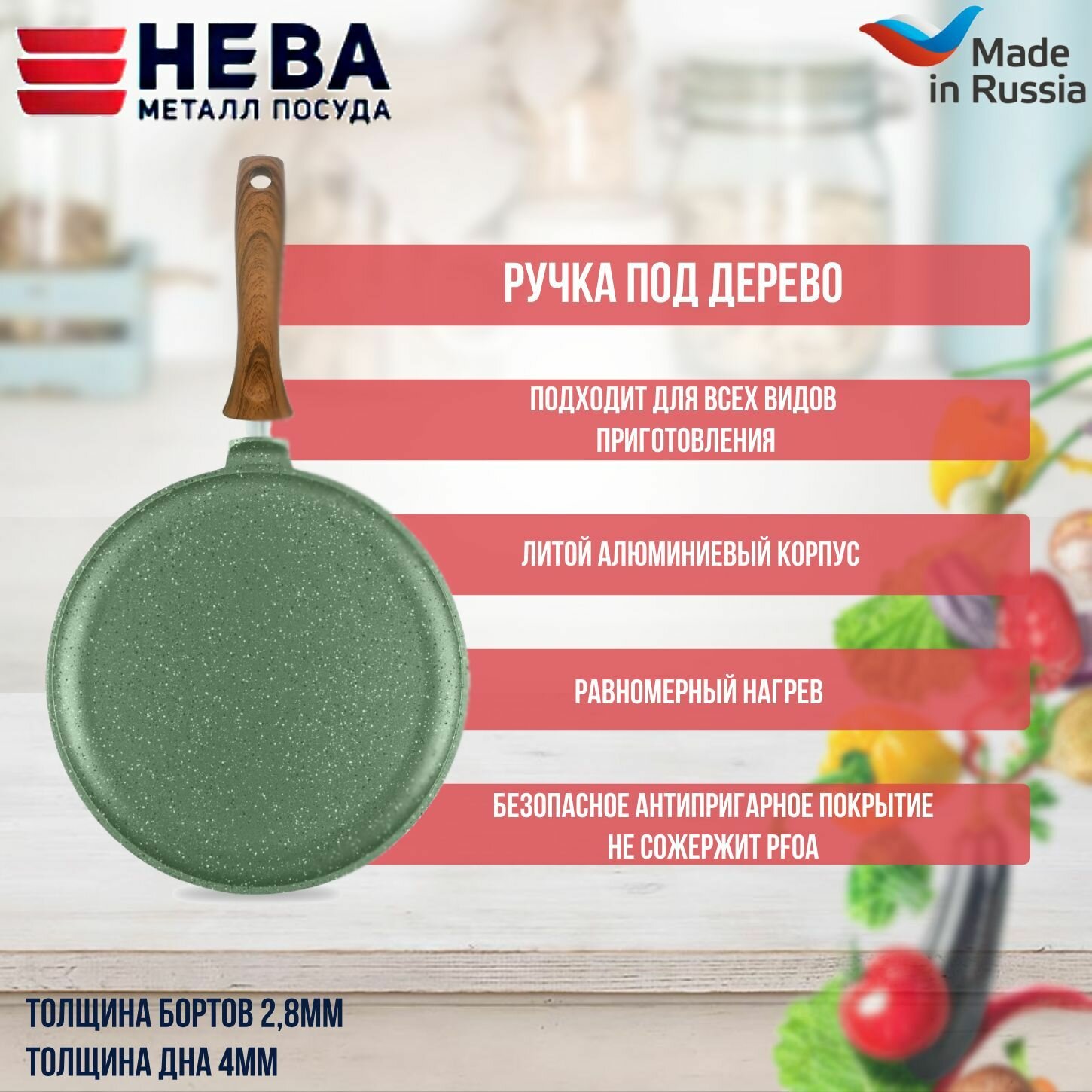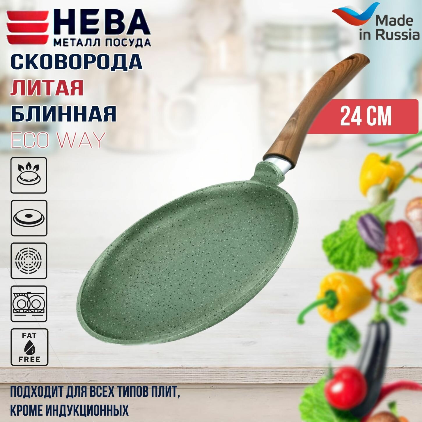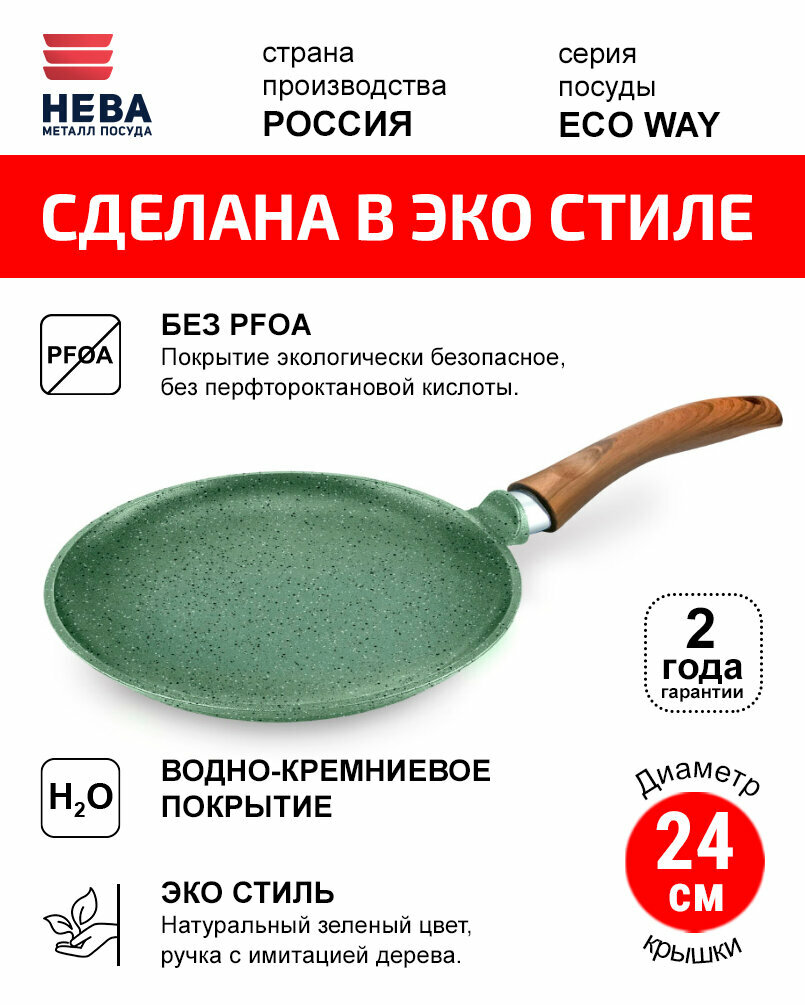 Сковорода для блинов 24 см для индукционной плиты литая с антипригарным покрытием Нева Металл Посуда ECO WAY с фиксированной ручкой и без крышки