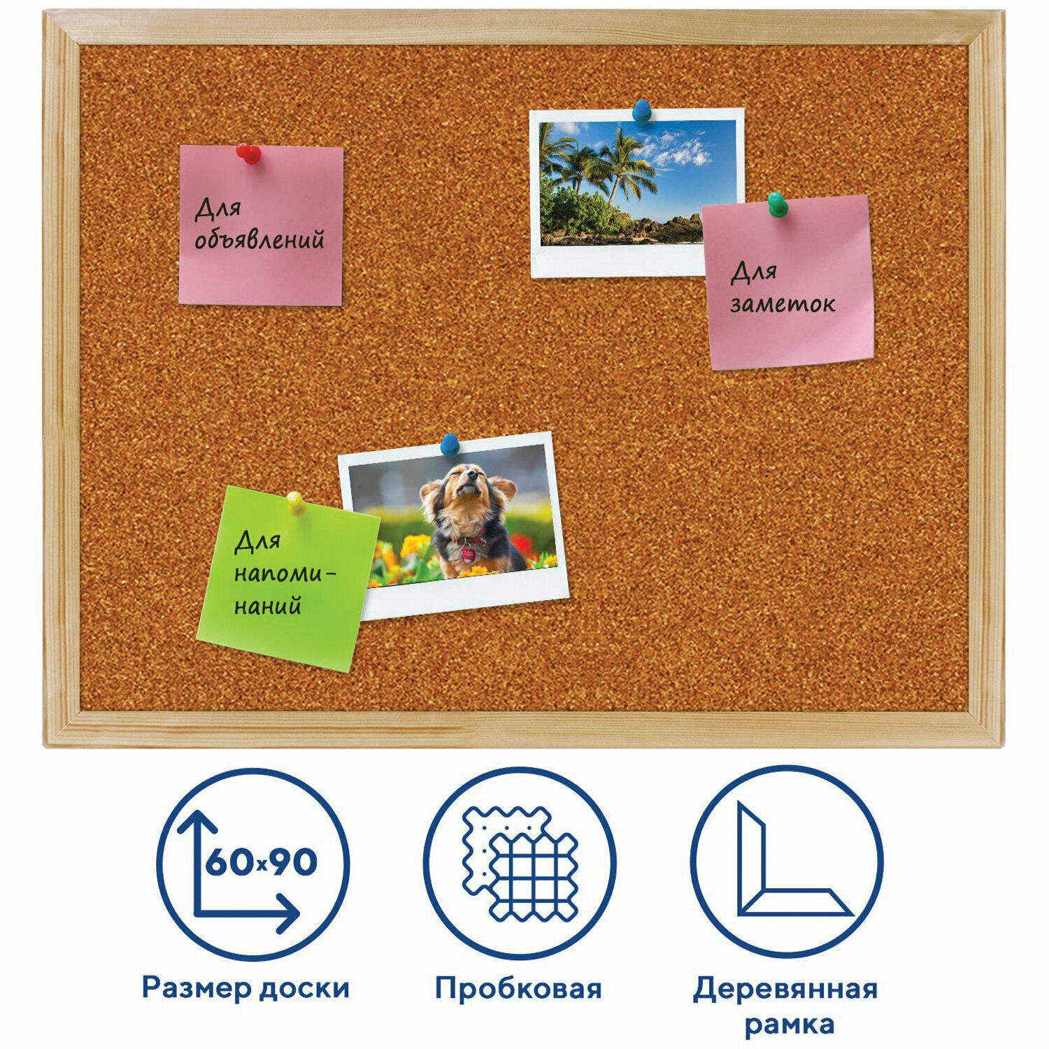 Купить Доска пробковая для объявлений 60х90 см, деревянная рамка, гарантия 10 ЛЕТ, россия, BRAUBERG, 236860