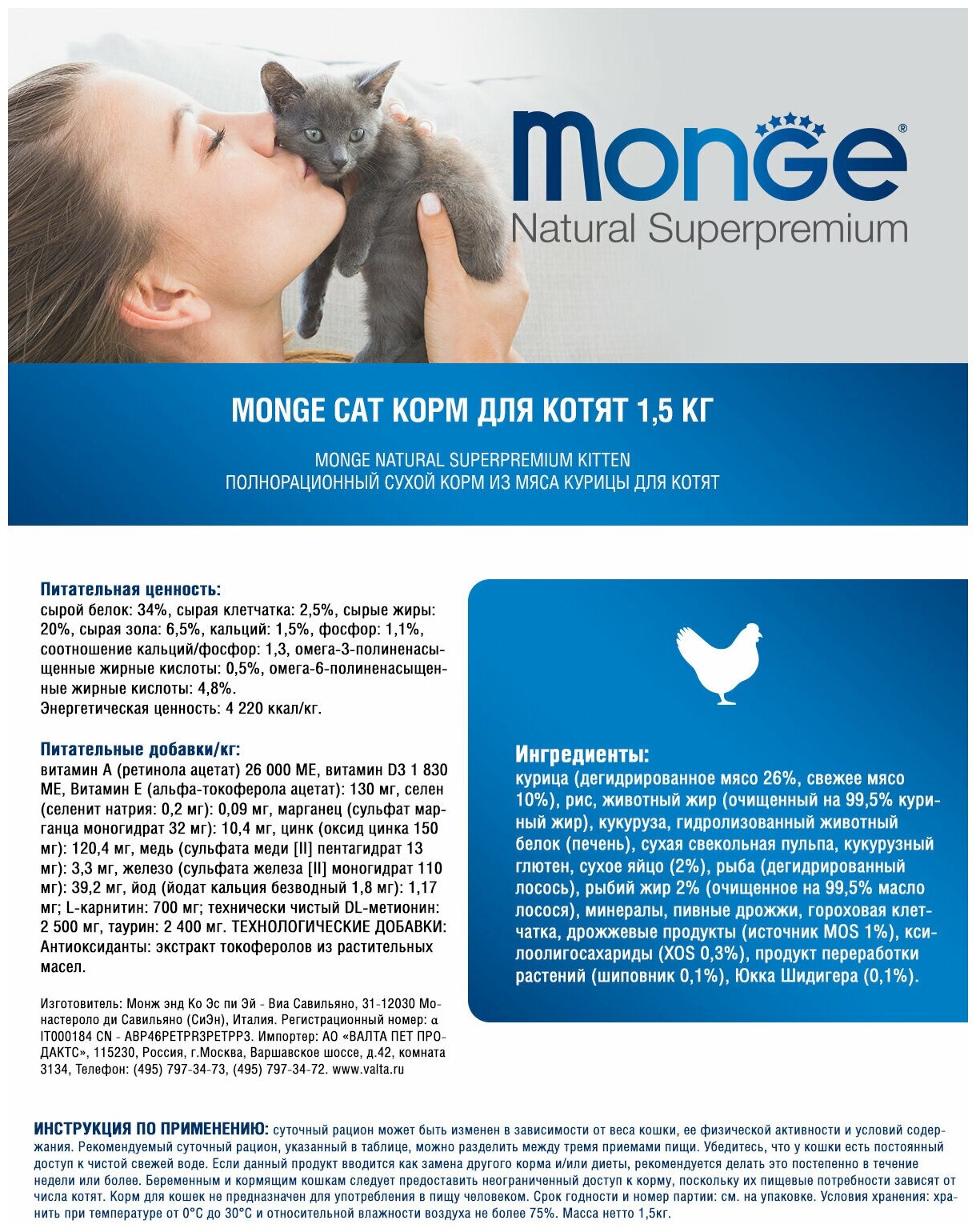 Сухой корм для котят Monge Natural Superpremium, с курицей 1.5 кг