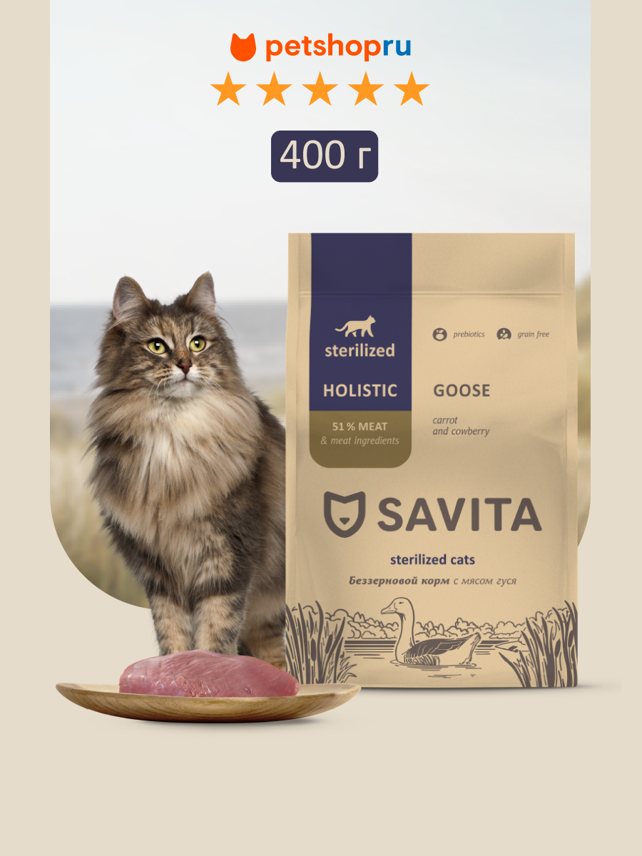 СохранитьБеззерновой корм SAVITA для стерилизованных кошек с мясом гуся, GRAIN FREE STERILIZED, Goose, 400 гр интересное: